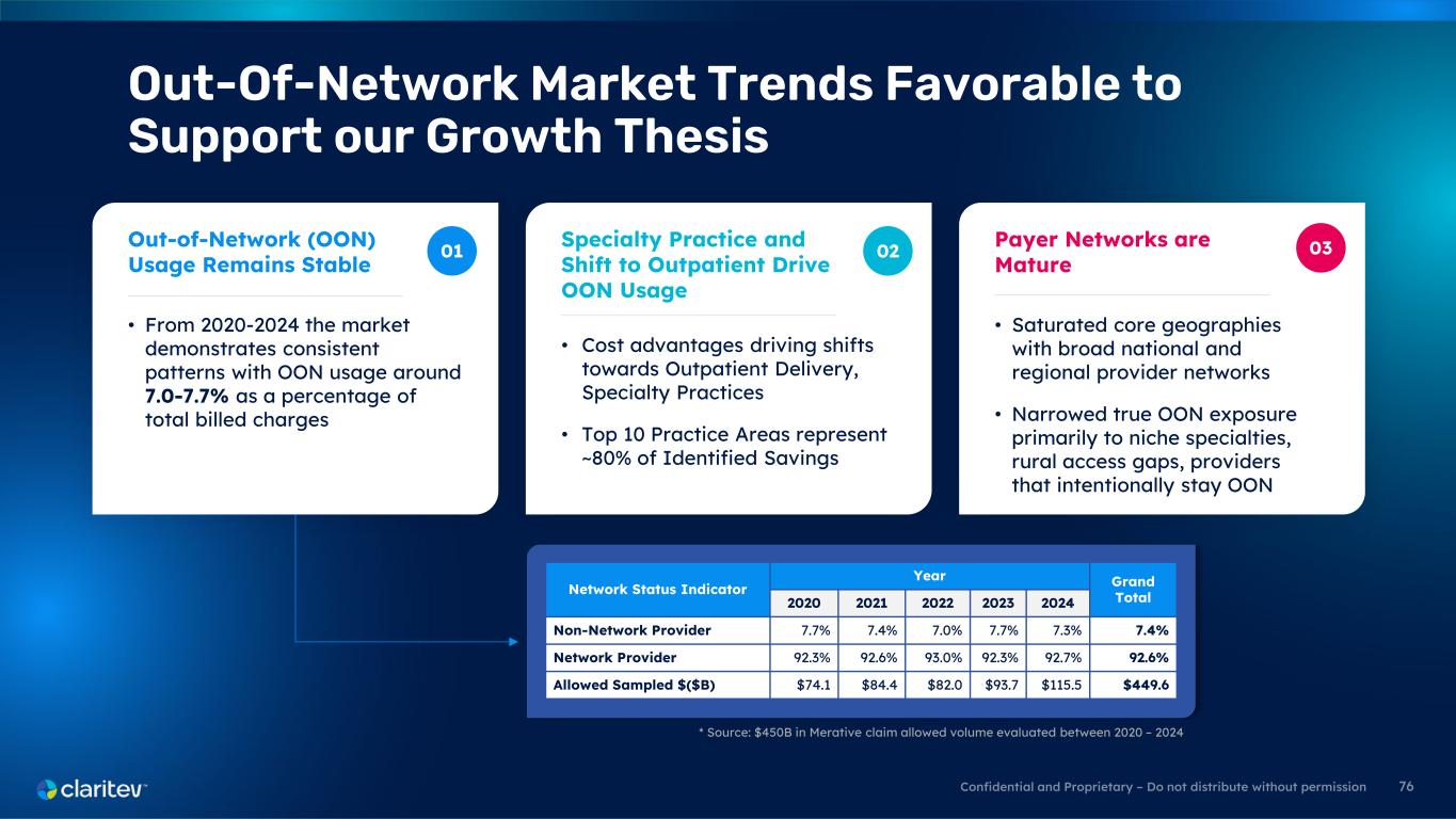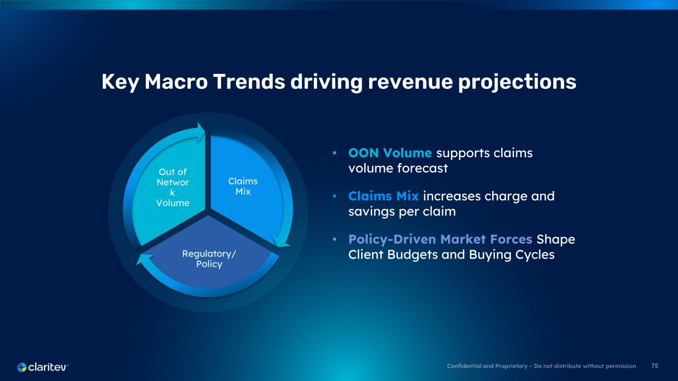 Confidential and Proprietary – Do not distribute without permission 75 Claims Mix Regulatory/ Policy Out of Networ k Volume Key Macro Trends driving revenue projections • OON Volume supports claims volume forecast • Claims Mix increases charge and savings per claim • Policy-Driven Market Forces Shape Client Budgets and Buying Cycles
