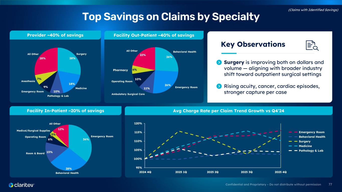 Confidential and Proprietary – Do not distribute without permission 77 36% 28% 15% 6% 12% Top Savings on Claims by Specialty (Claims with Identified Savings) Key Observations Surgery is improving both on dollars and volume — aligning with broader industry shift toward outpatient surgical settings Rising acuity, cancer, cardiac episodes, stronger capture per case 28% 18% 10% 9% 7% 28% Surgery Medicine Pathology & Lab Emergency Room Anesthesia All Other Facility Out-Patient ~40% of savings 26% 26% 11% 10% 6% 22% Behavioral Health Emergency Room Ambulatory Surgical Care Operating Room Pharmacy All Other Provider ~40% of savings Avg Charge Rate per Claim Trend Growth vs Q4’24 95% 100% 105% 110% 115% 120% 2024 4Q 2025 1Q 2025 2Q 2025 3Q 2025 4Q Emergency Room Behavioral Health Surgery Medicine Pathology & Lab Facility In-Patient ~20% of savings Emergency Room Behavioral Health Room & Board Operating Room 3% Medical/Surgical Supplies All Other