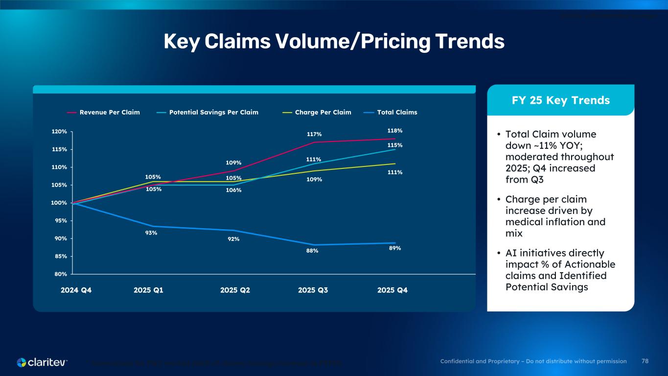 Confidential and Proprietary – Do not distribute without permission 78 Key Claims Volume/Pricing Trends 93% 92% 88% 89% 106% 109% 111% 105% 105% 111% 115% 105% 109% 117% 118% 80% 85% 90% 95% 100% 105% 110% 115% 120% 2025 Q1 2025 Q2 2025 Q3 Potential Savings Per ClaimRevenue Per Claim * Normalized for P&C market (shift of claims/savings/revenue to PEPM) Total Claims FY 25 Key Trends • Total Claim volume down ~11% YOY; moderated throughout 2025; Q4 increased from Q3 • Charge per claim increase driven by medical inflation and mix • AI initiatives directly impact % of Actionable claims and Identified Potential Savings2025 Q4 Charge Per Claim (Claims with Identified Savings) 2024 Q4