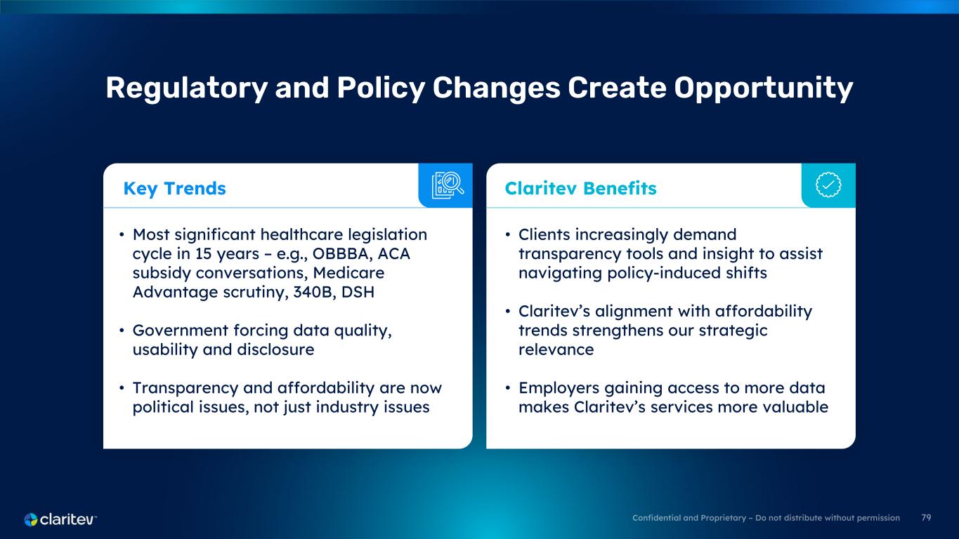 Confidential and Proprietary – Do not distribute without permission 79 Regulatory and Policy Changes Create Opportunity • Most significant healthcare legislation cycle in 15 years – e.g., OBBBA, ACA subsidy conversations, Medicare Advantage scrutiny, 340B, DSH • Government forcing data quality, usability and disclosure • Transparency and affordability are now political issues, not just industry issues Key Trends Claritev Benefits • Clients increasingly demand transparency tools and insight to assist navigating policy-induced shifts • Claritev’s alignment with affordability trends strengthens our strategic relevance • Employers gaining access to more data makes Claritev’s services more valuable