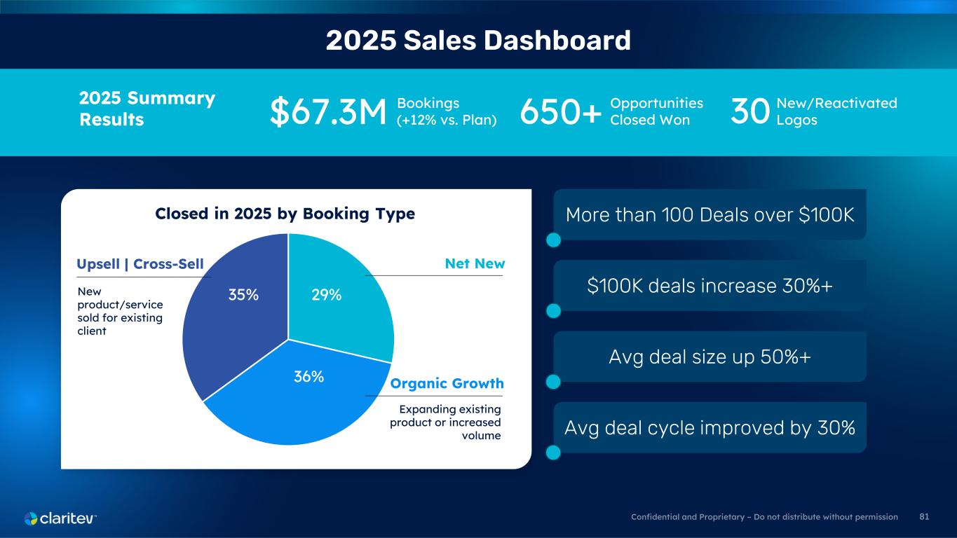 Confidential and Proprietary – Do not distribute without permission 81 2025 Sales Dashboard 2025 Summary Results $67.3M Bookings (+12% vs. Plan) 650+ Opportunities Closed Won 30 New/Reactivated Logos Closed in 2025 by Booking Type Organic Growth Expanding existing product or increased volume Upsell | Cross-Sell New product/service sold for existing client Net New 35% 29% 36% More than 100 Deals over $100K $100K deals increase 30%+ Avg deal cycle improved by 30% Avg deal size up 50%+