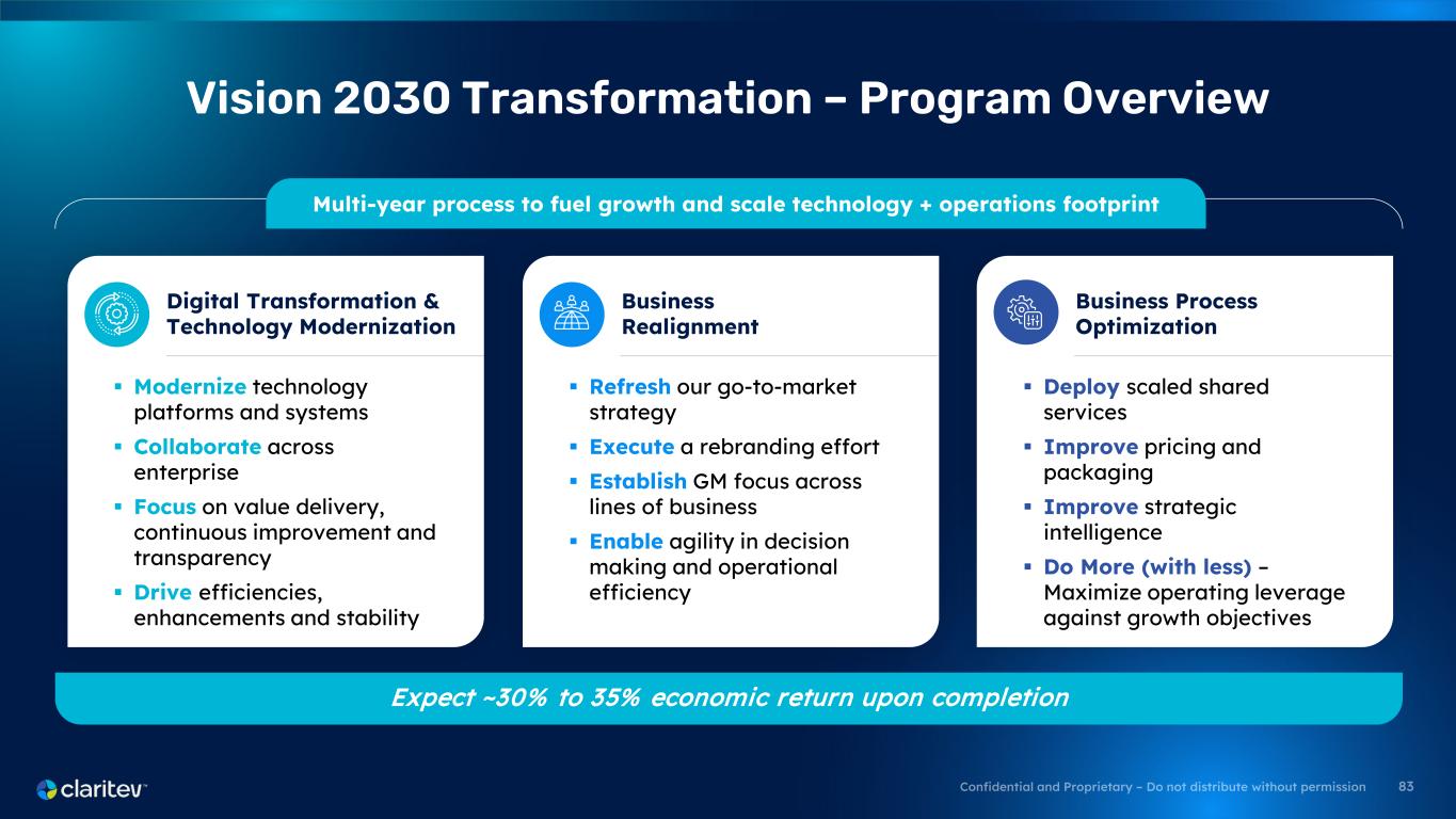 Confidential and Proprietary – Do not distribute without permission 83 Vision 2030 Transformation – Program Overview Digital Transformation & Technology Modernization Business Realignment Business Process Optimization  Modernize technology platforms and systems  Collaborate across enterprise  Focus on value delivery, continuous improvement and transparency  Drive efficiencies, enhancements and stability  Refresh our go-to-market strategy  Execute a rebranding effort  Establish GM focus across lines of business  Enable agility in decision making and operational efficiency  Deploy scaled shared services  Improve pricing and packaging  Improve strategic intelligence  Do More (with less) – Maximize operating leverage against growth objectives Multi-year process to fuel growth and scale technology + operations footprint Expect ~30% to 35% economic return upon completion