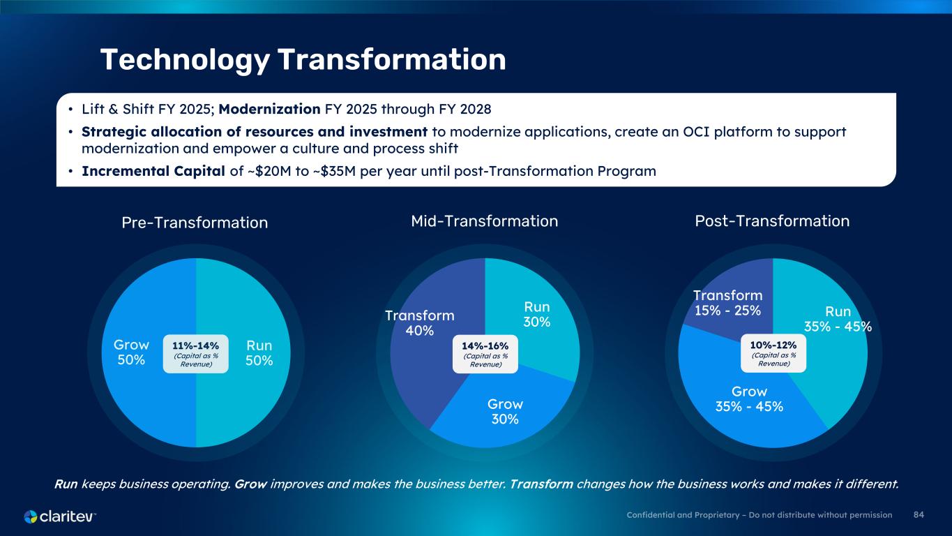 Confidential and Proprietary – Do not distribute without permission 84 Technology Transformation Run 50% Grow 50% Run 30% Grow 30% Transform 40% Run 35% - 45% Grow 35% - 45% Transform 15% - 25% Pre-Transformation Mid-Transformation Post-Transformation Run keeps business operating. Grow improves and makes the business better. Transform changes how the business works and makes it different. 11%-14% (Capital as % Revenue) 14%-16% (Capital as % Revenue) 10%-12% (Capital as % Revenue) • Lift & Shift FY 2025; Modernization FY 2025 through FY 2028 • Strategic allocation of resources and investment to modernize applications, create an OCI platform to support modernization and empower a culture and process shift • Incremental Capital of ~$20M to ~$35M per year until post-Transformation Program