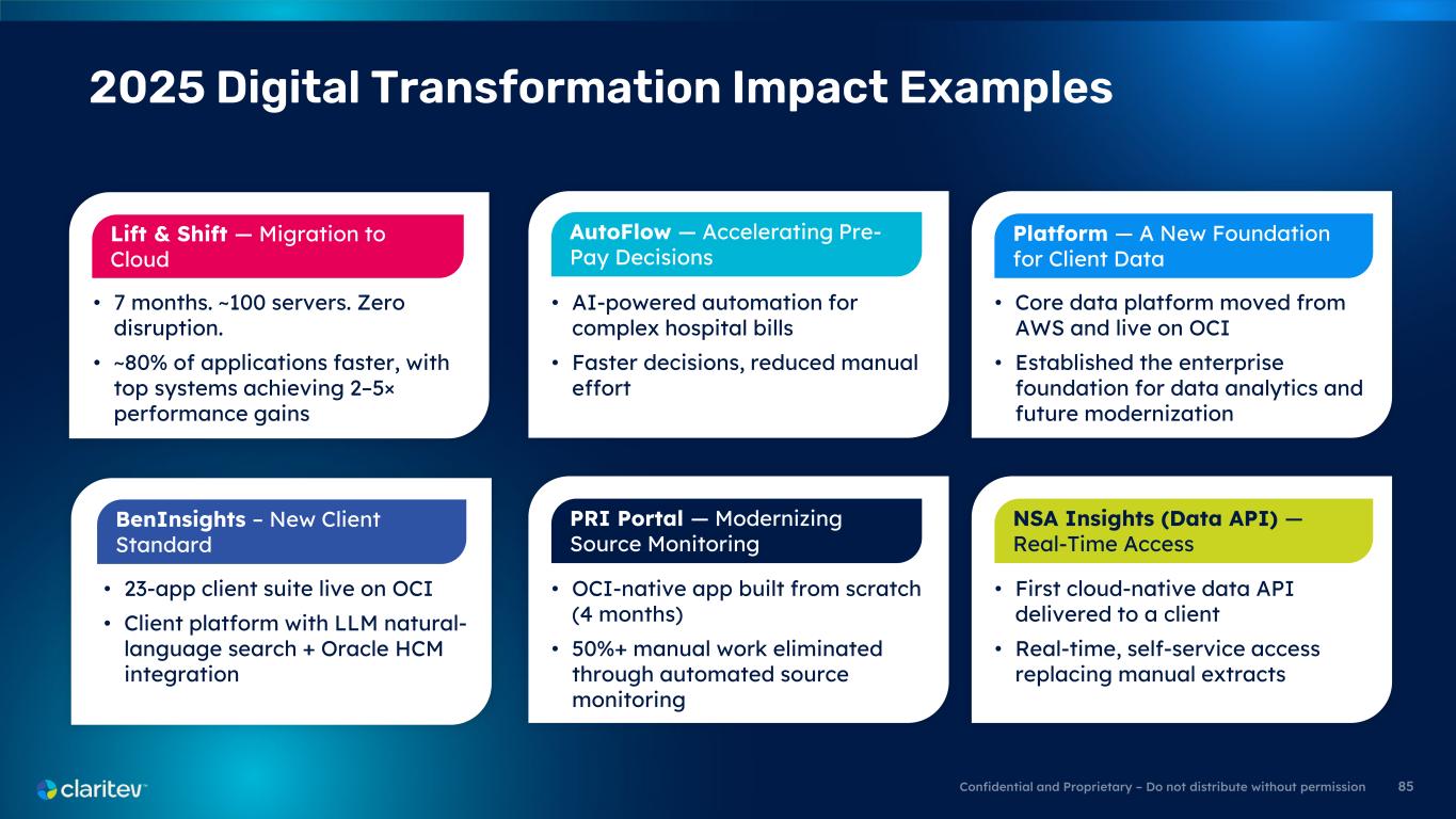 Confidential and Proprietary – Do not distribute without permission 85 2025 Digital Transformation Impact Examples • AI-powered automation for complex hospital bills • Faster decisions, reduced manual effort • Core data platform moved from AWS and live on OCI • Established the enterprise foundation for data analytics and future modernization • OCI-native app built from scratch (4 months) • 50%+ manual work eliminated through automated source monitoring • First cloud-native data API delivered to a client • Real-time, self-service access replacing manual extracts • 23-app client suite live on OCI • Client platform with LLM natural- language search + Oracle HCM integration • 7 months. ~100 servers. Zero disruption. • ~80% of applications faster, with top systems achieving 2–5× performance gains PRI Portal — Modernizing Source Monitoring BenInsights – New Client Standard Lift & Shift — Migration to Cloud AutoFlow — Accelerating Pre- Pay Decisions Platform — A New Foundation for Client Data NSA Insights (Data API) — Real-Time Access