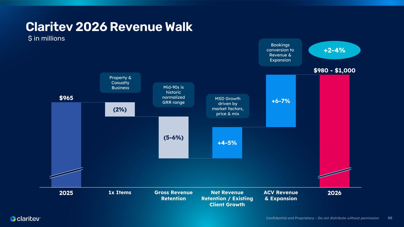 Confidential and Proprietary – Do not distribute without permission 88 2025 (2%) 1x Items (5-6%) Gross Revenue Retention +4-5% Net Revenue Retention / Existing Client Growth +6-7% ACV Revenue & Expansion 2026 $965 $980 - $1,000 Mid-90s is historic normalized GRR range Property & Casualty Business MSD Growth driven by market factors, price & mix Bookings conversion to Revenue & Expansion +2-4% Claritev 2026 Revenue Walk $ in millions