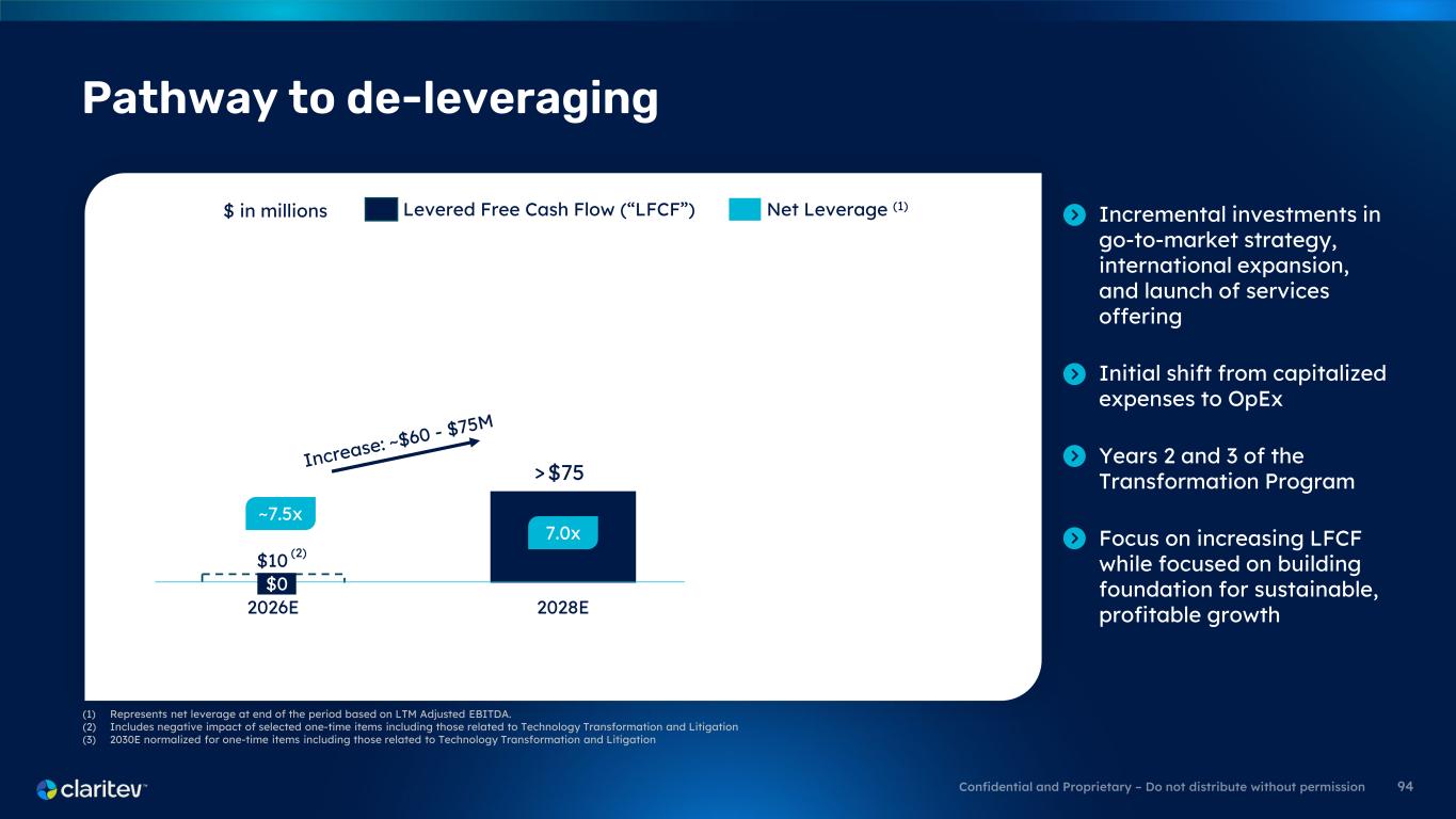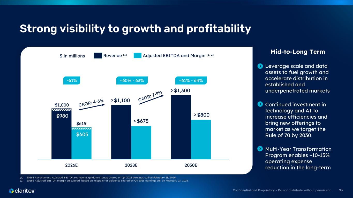 Confidential and Proprietary – Do not distribute without permission 93 $980 $1,100 $1,300 $605 $675 $800 2026E 2028E 2030E > Strong visibility to growth and profitability Revenue (1) Adjusted EBITDA and Margin (1, 2) Mid-to-Long Term Leverage scale and data assets to fuel growth and accelerate distribution in established and underpenetrated markets Continued investment in technology and AI to increase efficiencies and bring new offerings to market as we target the Rule of 70 by 2030 Multi-Year Transformation Program enables ~10-15% operating expense reduction in the long-term $ in millions (1) 2026E Revenue and Adjusted EBITDA represents guidance range shared on Q4 2025 earnings call on February 23, 2026. (2) 2026E Adjusted EBITDA margin calculated based on midpoint of guidance shared on Q4 2025 earnings call on February 23, 2026. $1,000 $615 > > > ~61% ~60% - 63% ~61% - 64%