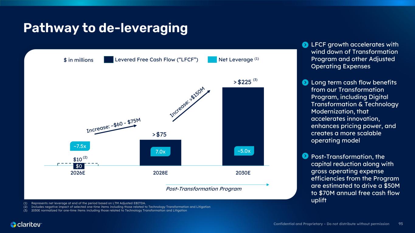 Confidential and Proprietary – Do not distribute without permission 94 $75 $225 2026E 2028E 2030E Pathway to de-leveraging Levered Free Cash Flow (“LFCF”) Net Leverage (1) Incremental investments in go-to-market strategy, international expansion, and launch of services offering Initial shift from capitalized expenses to OpEx Years 2 and 3 of the Transformation Program Focus on increasing LFCF while focused on building foundation for sustainable, profitable growth $ in millions (1) Represents net leverage at end of the period based on LTM Adjusted EBITDA. (2) Includes negative impact of selected one-time items including those related to Technology Transformation and Litigation (3) 2030E normalized for one-time items including those related to Technology Transformation and Litigation 7.0x (3) (2) ~5.0x $10 ~7.5x $0 (3)> >
