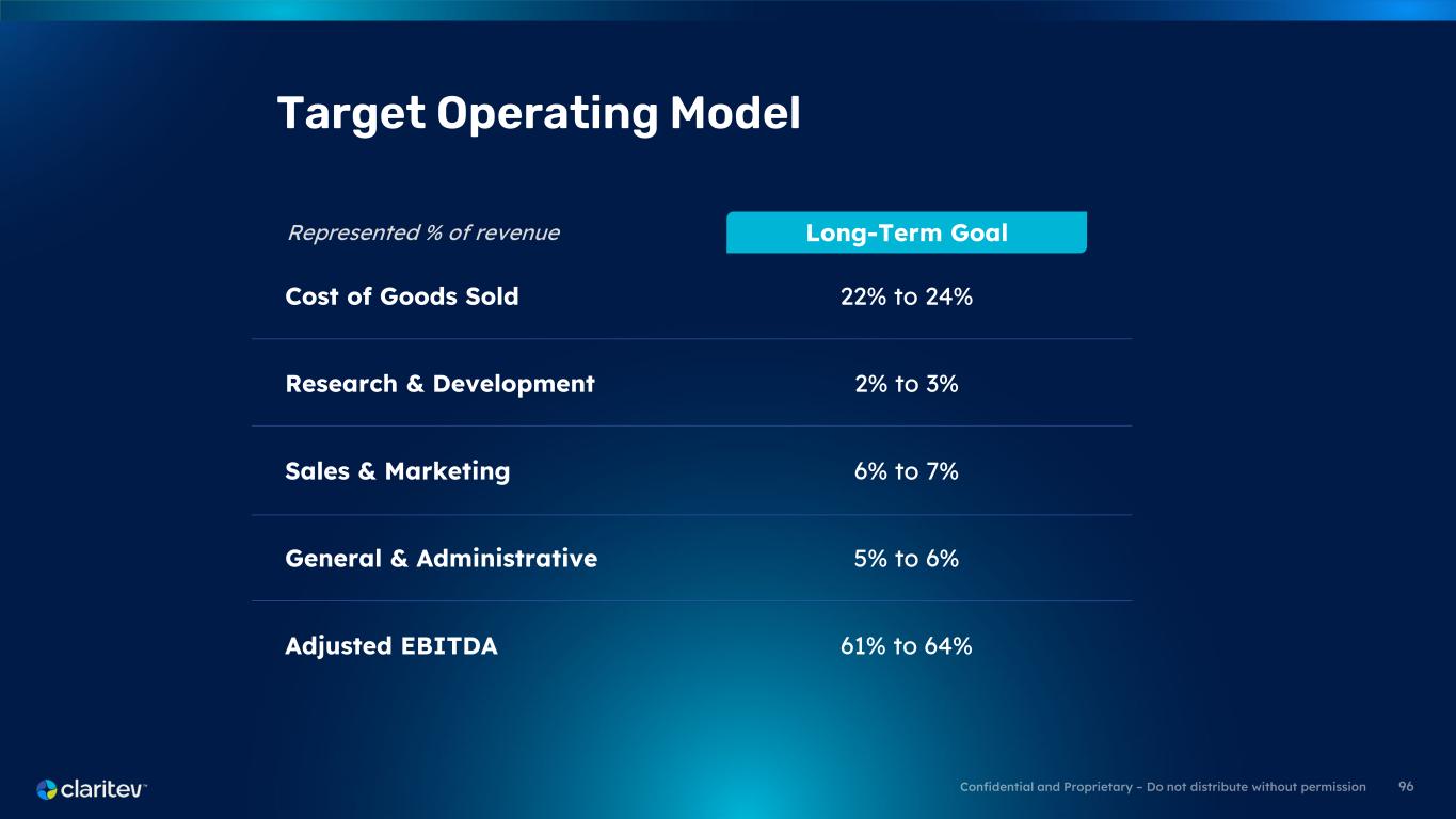 Confidential and Proprietary – Do not distribute without permission 96 Target Operating Model Cost of Goods Sold Research & Development Sales & Marketing General & Administrative Adjusted EBITDA 22% to 24% 2% to 3% 6% to 7% 5% to 6% 61% to 64% Long-Term GoalRepresented % of revenue
