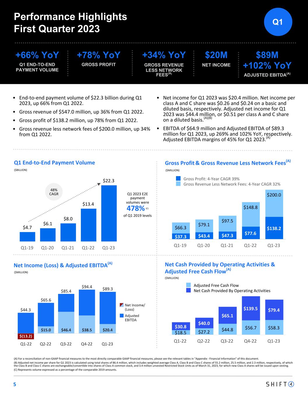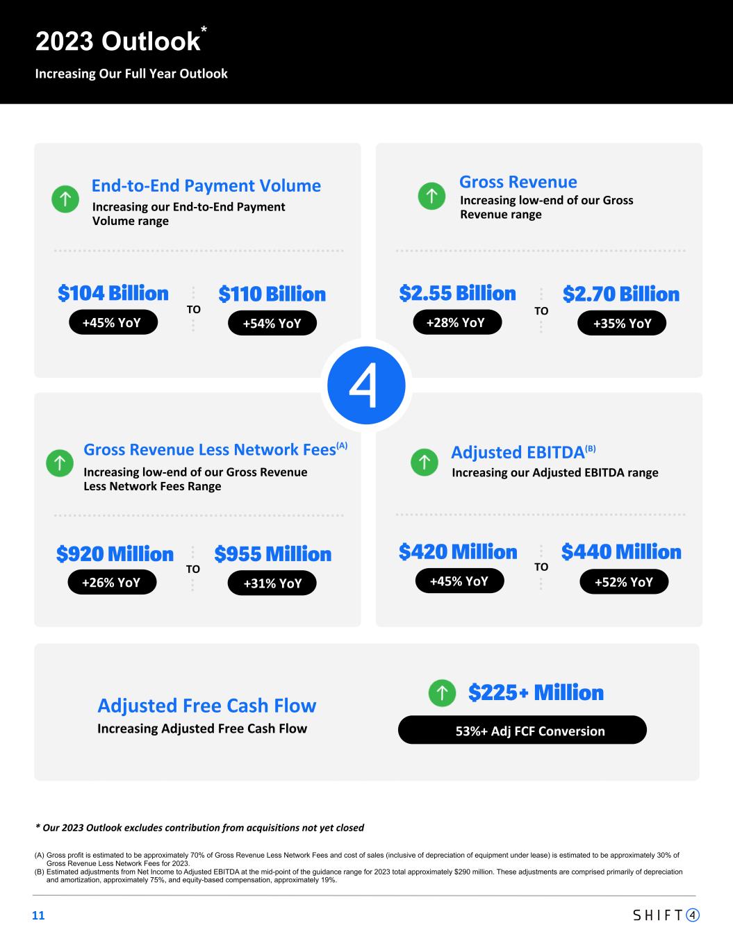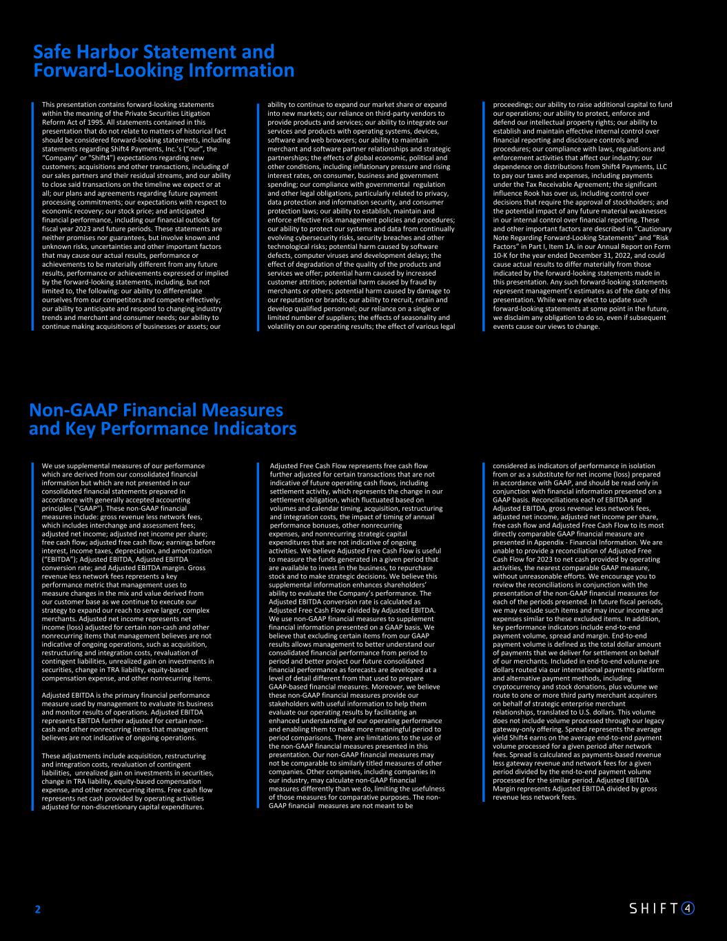 Non-GAAP Financial Measures and Key Performance Indicators Safe Harbor Statement and Forward-Looking Information We use supplemental measures of our performance which are derived from our consolidated financial information but which are not presented in our consolidated financial statements prepared in accordance with generally accepted accounting principles ("GAAP"). These non-GAAP financial measures include: gross revenue less network fees, which includes interchange and assessment fees; adjusted net income; adjusted net income per share; free cash flow; adjusted free cash flow; earnings before interest, income taxes, depreciation, and amortization (“EBITDA”); Adjusted EBITDA, Adjusted EBITDA conversion rate; and Adjusted EBITDA margin. Gross revenue less network fees represents a key performance metric that management uses to measure changes in the mix and value derived from our customer base as we continue to execute our strategy to expand our reach to serve larger, complex merchants. Adjusted net income represents net income (loss) adjusted for certain non-cash and other nonrecurring items that management believes are not indicative of ongoing operations, such as acquisition, restructuring and integration costs, revaluation of contingent liabilities, unrealized gain on investments in securities, change in TRA liability, equity-based compensation expense, and other nonrecurring items. Adjusted EBITDA is the primary financial performance measure used by management to evaluate its business and monitor results of operations. Adjusted EBITDA represents EBITDA further adjusted for certain non- cash and other nonrecurring items that management believes are not indicative of ongoing operations. These adjustments include acquisition, restructuring and integration costs, revaluation of contingent liabilities, unrealized gain on investments in securities, change in TRA liability, equity-based compensation expense, and other nonrecurring items. Free cash flow represents net cash provided by operating activities adjusted for non-discretionary capital expenditures. This presentation contains forward-looking statements within the meaning of the Private Securities Litigation Reform Act of 1995. All statements contained in this presentation that do not relate to matters of historical fact should be considered forward-looking statements, including statements regarding Shift4 Payments, Inc.’s (“our”, the “Company” or "Shift4”) expectations regarding new customers; acquisitions and other transactions, including of our sales partners and their residual streams, and our ability to close said transactions on the timeline we expect or at all; our plans and agreements regarding future payment processing commitments; our expectations with respect to economic recovery; our stock price; and anticipated financial performance, including our financial outlook for fiscal year 2023 and future periods. These statements are neither promises nor guarantees, but involve known and unknown risks, uncertainties and other important factors that may cause our actual results, performance or achievements to be materially different from any future results, performance or achievements expressed or implied by the forward-looking statements, including, but not limited to, the following: our ability to differentiate ourselves from our competitors and compete effectively; our ability to anticipate and respond to changing industry trends and merchant and consumer needs; our ability to continue making acquisitions of businesses or assets; our Adjusted Free Cash Flow represents free cash flow further adjusted for certain transactions that are not indicative of future operating cash flows, including settlement activity, which represents the change in our settlement obligation, which fluctuated based on volumes and calendar timing, acquisition, restructuring and integration costs, the impact of timing of annual performance bonuses, other nonrecurring expenses, and nonrecurring strategic capital expenditures that are not indicative of ongoing activities. We believe Adjusted Free Cash Flow is useful to measure the funds generated in a given period that are available to invest in the business, to repurchase stock and to make strategic decisions. We believe this supplemental information enhances shareholders’ ability to evaluate the Company’s performance. The Adjusted EBITDA conversion rate is calculated as Adjusted Free Cash Flow divided by Adjusted EBITDA. We use non-GAAP financial measures to supplement financial information presented on a GAAP basis. We believe that excluding certain items from our GAAP results allows management to better understand our consolidated financial performance from period to period and better project our future consolidated financial performance as forecasts are developed at a level of detail different from that used to prepare GAAP-based financial measures. Moreover, we believe these non-GAAP financial measures provide our stakeholders with useful information to help them evaluate our operating results by facilitating an enhanced understanding of our operating performance and enabling them to make more meaningful period to period comparisons. There are limitations to the use of the non-GAAP financial measures presented in this presentation. Our non-GAAP financial measures may not be comparable to similarly titled measures of other companies. Other companies, including companies in our industry, may calculate non-GAAP financial measures differently than we do, limiting the usefulness of those measures for comparative purposes. The non- GAAP financial measures are not meant to be ability to continue to expand our market share or expand into new markets; our reliance on third-party vendors to provide products and services; our ability to integrate our services and products with operating systems, devices, software and web browsers; our ability to maintain merchant and software partner relati
