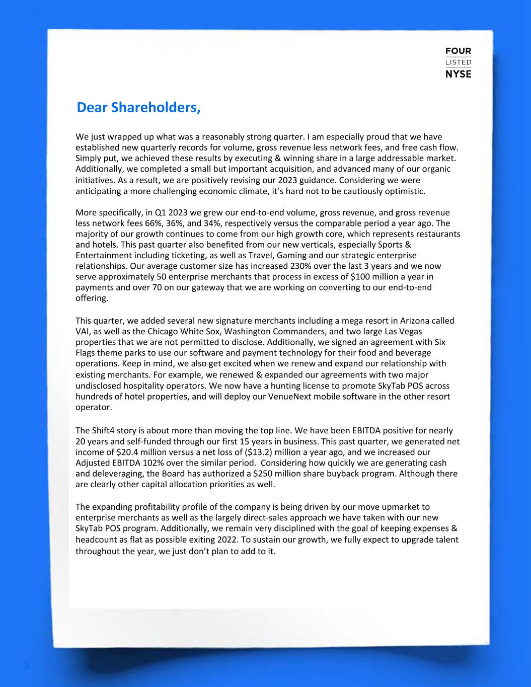 Dear Shareholders, 3 We just wrapped up what was a reasonably strong quarter. I am especially proud that we have established new quarterly records for volume, gross revenue less network fees, and free cash flow. Simply put, we achieved these results by executing & winning share in a large addressable market. Additionally, we completed a small but important acquisition, and advanced many of our organic initiatives. As a result, we are positively revising our 2023 guidance. Considering we were anticipating a more challenging economic climate, it’s hard not to be cautiously optimistic. More specifically, in Q1 2023 we grew our end-to-end volume, gross revenue, and gross revenue less network fees 66%, 36%, and 34%, respectively versus the comparable period a year ago. The majority of our growth continues to come from our high growth core, which represents restaurants and hotels. This past quarter also benefited from our new verticals, especially Sports & Entertainment including ticketing, as well as Travel, Gaming and our strategic enterprise relationships. Our average customer size has increased 230% over the last 3 years and we now serve approximately 50 enterprise merchants that process in excess of $100 million a year in payments and over 70 on our gateway that we are working on converting to our end-to-end offering. This quarter, we added several new signature merchants including a mega resort in Arizona called VAI, as well as the Chicago White Sox, Washington Commanders, and two large Las Vegas properties that we are not permitted to disclose. Additionally, we signed an agreement with Six Flags theme parks to use our software and payment technology for their food and beverage operations. Keep in mind, we also get excited when we renew and expand our relationship with existing merchants. For example, we renewed & expanded our agreements with two major undisclosed hospitality operators. We now have a hunting license to promote SkyTab POS across hundreds of hotel properties, and will deploy our VenueNext mobile software in the other resort operator. The Shift4 story is about more than moving the top line. We have been EBITDA positive for nearly 20 years and self-funded through our first 15 years in business. This past quarter, we generated net income of $20.4 million versus a net loss of ($13.2) million a year ago, and we increased our Adjusted EBITDA 102% over the similar period. Considering how quickly we are generating cash and deleveraging, the Board has authorized a $250 million share buyback program. Although there are clearly other capital allocation priorities as well. The expanding profitability profile of the company is being driven by our move upmarket to enterprise merchants as well as the largely direct-sales approach we have taken with our new SkyTab POS program. Additionally, we remain very disciplined with the goal of keeping expenses & headcount as flat as possible exiting 2022. To sustain our growth, we fully expect to upgrade talent throughout the year, we just don’t plan to add to it.