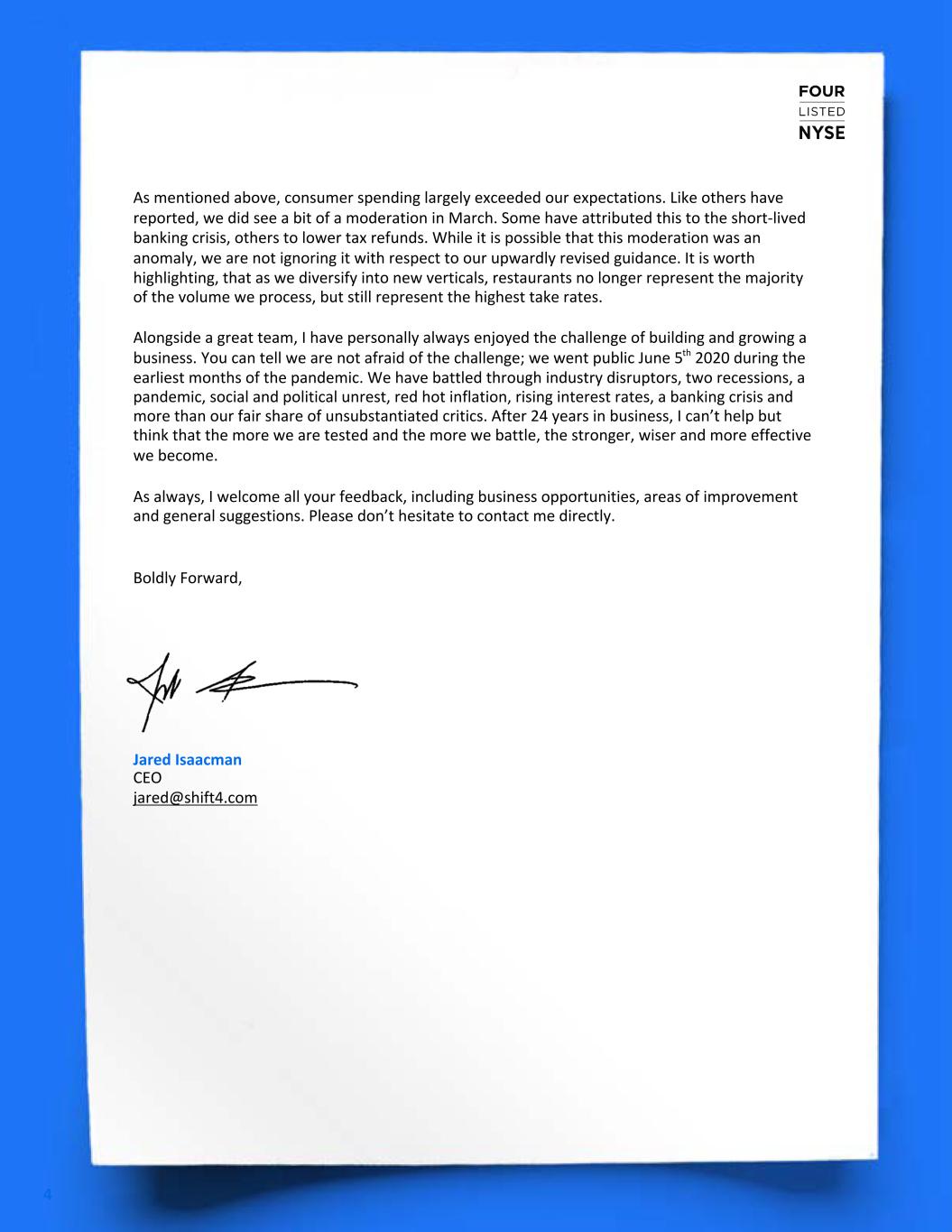 4 As mentioned above, consumer spending largely exceeded our expectations. Like others have reported, we did see a bit of a moderation in March. Some have attributed this to the short-lived banking crisis, others to lower tax refunds. While it is possible that this moderation was an anomaly, we are not ignoring it with respect to our upwardly revised guidance. It is worth highlighting, that as we diversify into new verticals, restaurants no longer represent the majority of the volume we process, but still represent the highest take rates. Alongside a great team, I have personally always enjoyed the challenge of building and growing a business. You can tell we are not afraid of the challenge; we went public June 5th 2020 during the earliest months of the pandemic. We have battled through industry disruptors, two recessions, a pandemic, social and political unrest, red hot inflation, rising interest rates, a banking crisis and more than our fair share of unsubstantiated critics. After 24 years in business, I can’t help but think that the more we are tested and the more we battle, the stronger, wiser and more effective we become. As always, I welcome all your feedback, including business opportunities, areas of improvement and general suggestions. Please don’t hesitate to contact me directly. Boldly Forward, Jared Isaacman CEO jared@shift4.com