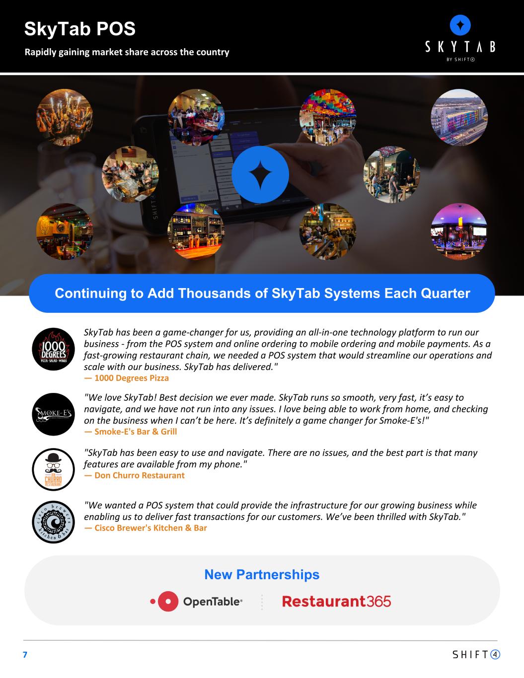 7 SkyTab POS Rapidly gaining market share across the country Continuing to Add Thousands of SkyTab Systems Each Quarter "We love SkyTab! Best decision we ever made. SkyTab runs so smooth, very fast, it’s easy to navigate, and we have not run into any issues. I love being able to work from home, and checking on the business when I can’t be here. It’s definitely a game changer for Smoke-E's!" — Smoke-E's Bar & Grill "SkyTab has been easy to use and navigate. There are no issues, and the best part is that many features are available from my phone." — Don Churro Restaurant "We wanted a POS system that could provide the infrastructure for our growing business while enabling us to deliver fast transactions for our customers. We’ve been thrilled with SkyTab." — Cisco Brewer's Kitchen & Bar New Partnerships SkyTab has been a game-changer for us, providing an all-in-one technology platform to run our business - from the POS system and online ordering to mobile ordering and mobile payments. As a fast-growing restaurant chain, we needed a POS system that would streamline our operations and scale with our business. SkyTab has delivered." — 1000 Degrees Pizza