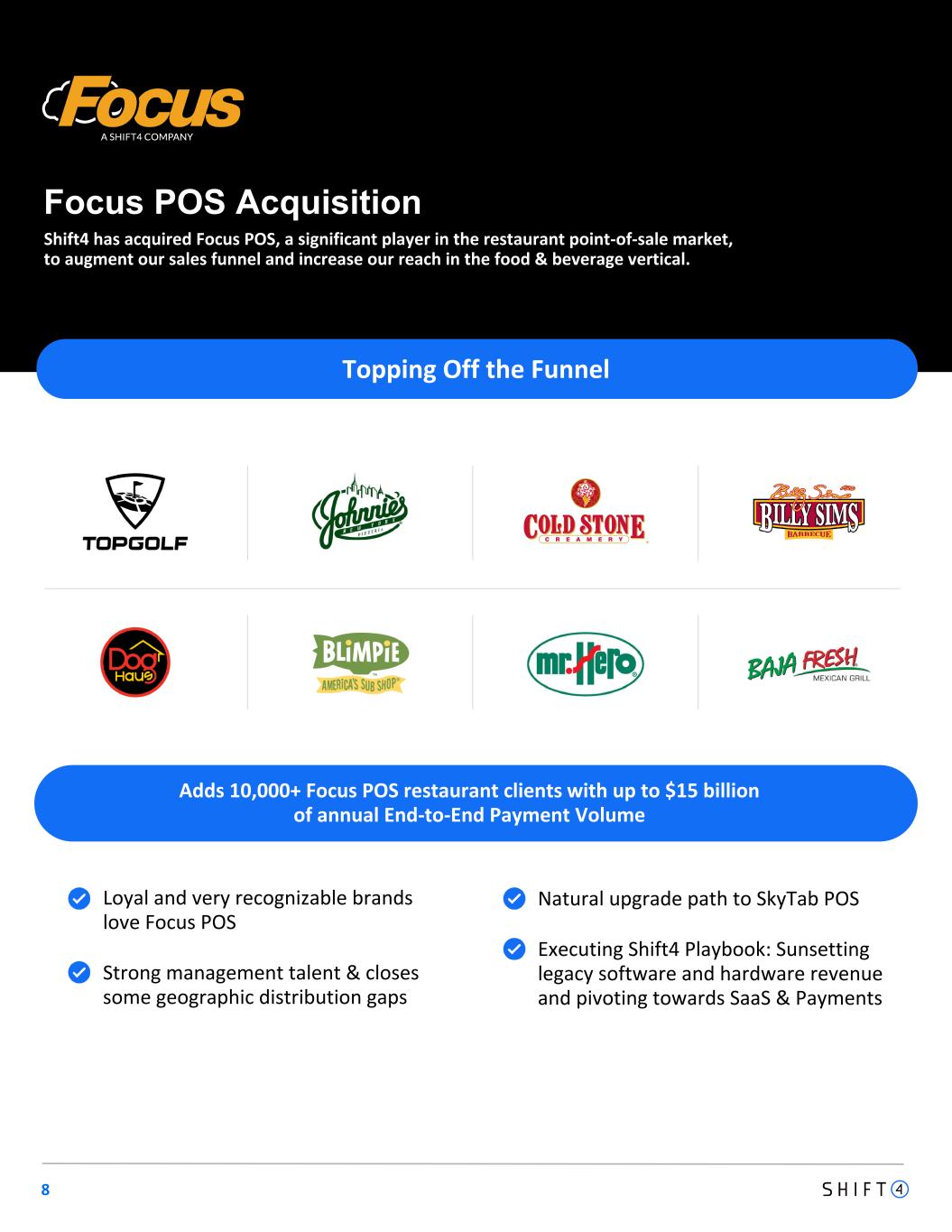 8 Focus POS Acquisition Shift4 has acquired Focus POS, a significant player in the restaurant point-of-sale market, to augment our sales funnel and increase our reach in the food & beverage vertical. Topping Off the Funnel Loyal and very recognizable brands love Focus POS Strong management talent & closes some geographic distribution gaps Natural upgrade path to SkyTab POS Executing Shift4 Playbook: Sunsetting legacy software and hardware revenue and pivoting towards SaaS & Payments Adds 10,000+ Focus POS restaurant clients with up to $15 billion of annual End-to-End Payment Volume