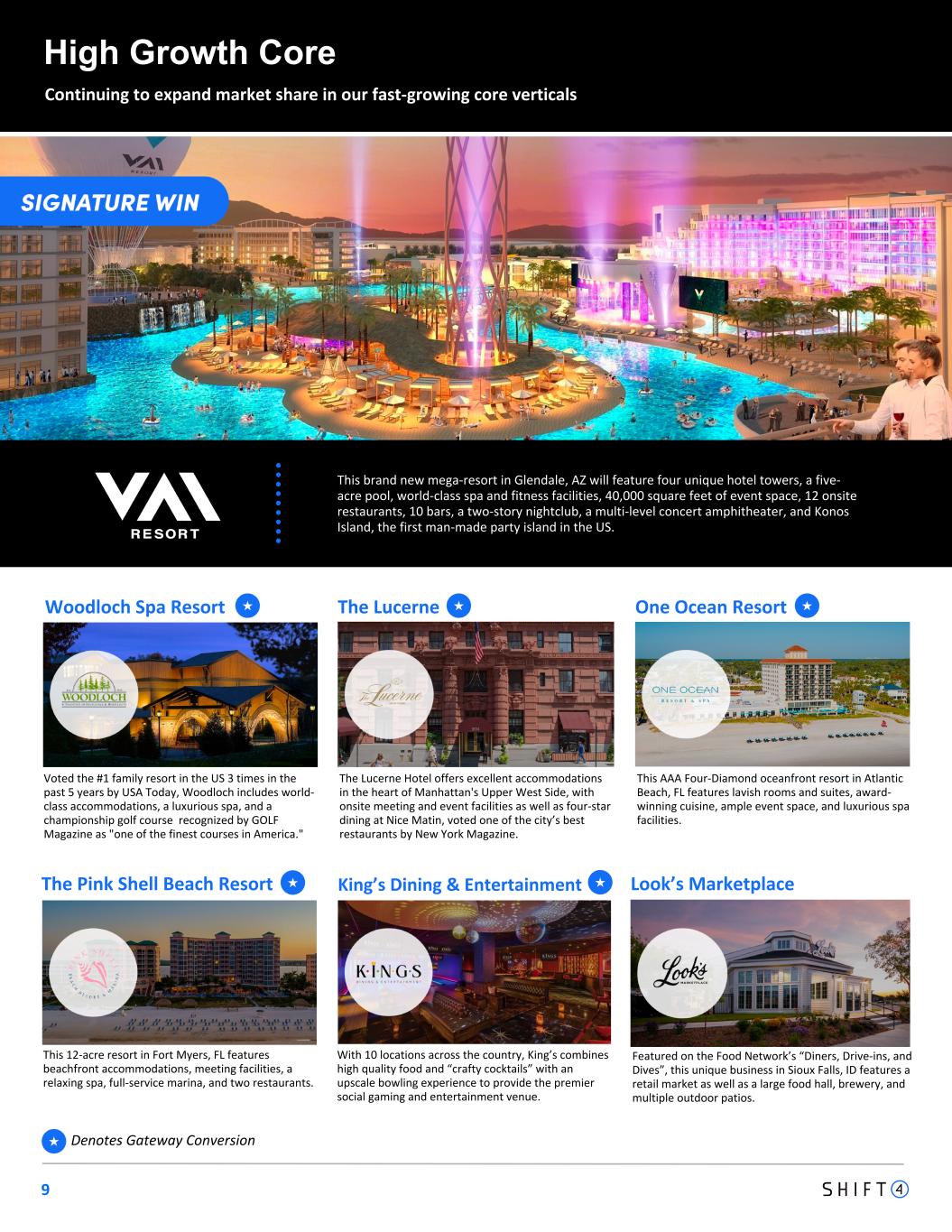 9 High Growth Core Continuing to expand market share in our fast-growing core verticals Denotes Gateway Conversion★ The Lucerne Hotel offers excellent accommodations in the heart of Manhattan's Upper West Side, with onsite meeting and event facilities as well as four-star dining at Nice Matin, voted one of the city’s best restaurants by New York Magazine. The Lucerne This AAA Four-Diamond oceanfront resort in Atlantic Beach, FL features lavish rooms and suites, award- winning cuisine, ample event space, and luxurious spa facilities. One Ocean Resort This 12-acre resort in Fort Myers, FL features beachfront accommodations, meeting facilities, a relaxing spa, full-service marina, and two restaurants. The Pink Shell Beach Resort With 10 locations across the country, King’s combines high quality food and “crafty cocktails” with an upscale bowling experience to provide the premier social gaming and entertainment venue. King’s Dining & Entertainment Featured on the Food Network’s “Diners, Drive-ins, and Dives”, this unique business in Sioux Falls, ID features a retail market as well as a large food hall, brewery, and multiple outdoor patios. Look’s Marketplace Voted the #1 family resort in the US 3 times in the past 5 years by USA Today, Woodloch includes world- class accommodations, a luxurious spa, and a championship golf course recognized by GOLF Magazine as "one of the finest courses in America." Woodloch Spa Resort ★ ★ This brand new mega-resort in Glendale, AZ will feature four unique hotel towers, a five- acre pool, world-class spa and fitness facilities, 40,000 square feet of event space, 12 onsite restaurants, 10 bars, a two-story nightclub, a multi-level concert amphitheater, and Konos Island, the first man-made party island in the US. ★ ★ ★