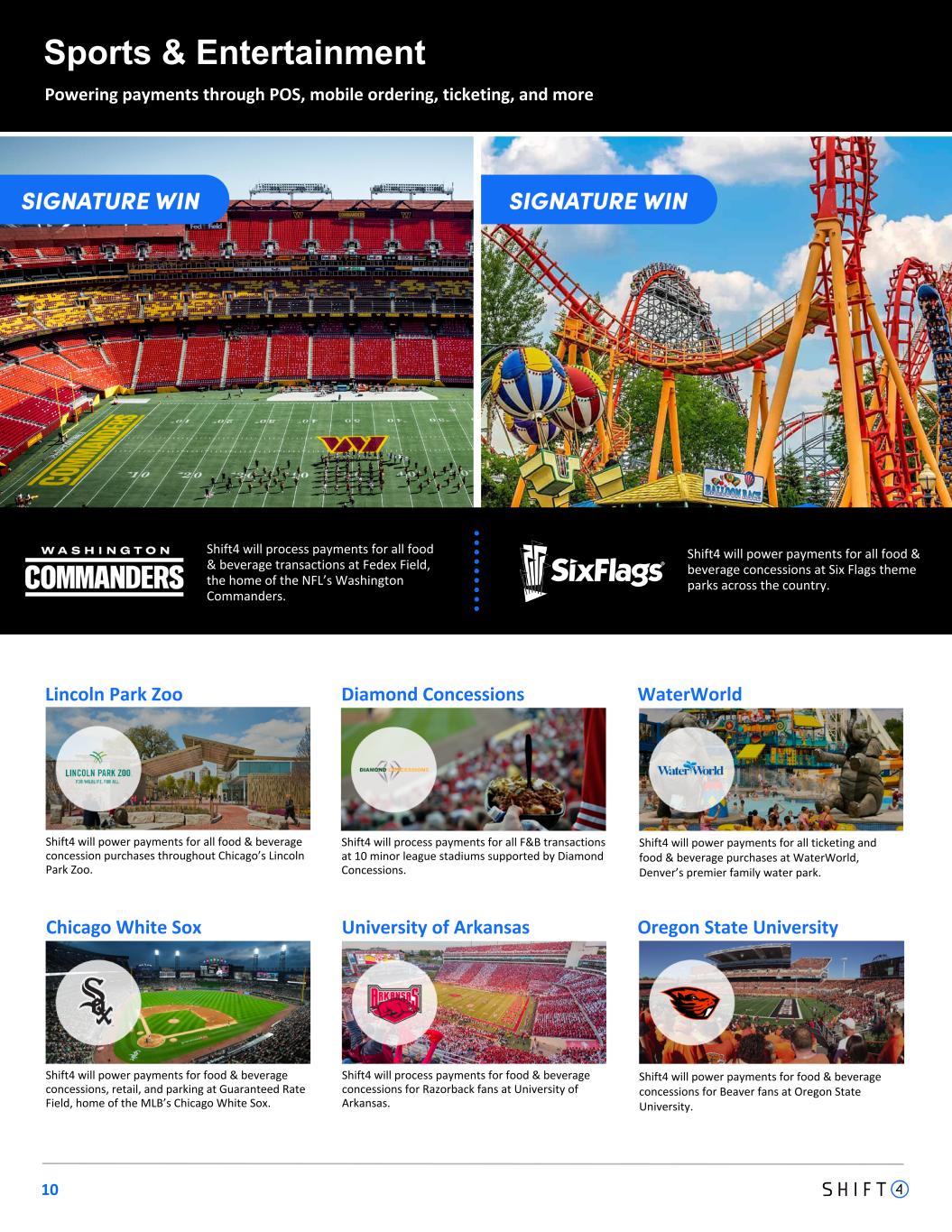 10 Sports & Entertainment Powering payments through POS, mobile ordering, ticketing, and more Diamond Concessions Shift4 will process payments for food & beverage concessions for Razorback fans at University of Arkansas. University of Arkansas Chicago White Sox Shift4 will power payments for food & beverage concessions, retail, and parking at Guaranteed Rate Field, home of the MLB’s Chicago White Sox. Shift4 will power payments for all food & beverage concession purchases throughout Chicago’s Lincoln Park Zoo. Lincoln Park Zoo WaterWorld Oregon State University Shift4 will power payments for all ticketing and food & beverage purchases at WaterWorld, Denver’s premier family water park. Shift4 will power payments for food & beverage concessions for Beaver fans at Oregon State University. Shift4 will process payments for all food & beverage transactions at Fedex Field, the home of the NFL’s Washington Commanders. Shift4 will process payments for all F&B transactions at 10 minor league stadiums supported by Diamond Concessions. Shift4 will power payments for all food & beverage concessions at Six Flags theme parks across the country.