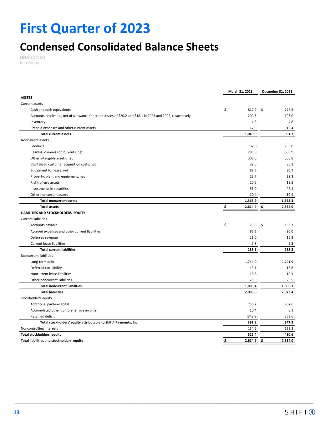13 First Quarter of 2023 Condensed Consolidated Balance Sheets UNAUDITED In millions March 31, 2023 December 31, 2022 ASSETS Current assets Cash and cash equivalents $ 817.9 $ 776.5 Accounts receivable, net of allowance for credit losses of $20.2 and $18.1 in 2023 and 2022, respectively 209.3 195.0 Inventory 4.3 4.8 Prepaid expenses and other current assets 17.5 15.4 Total current assets 1,049.0 991.7 Noncurrent assets Goodwill 737.0 735.0 Residual commission buyouts, net 283.0 303.9 Other intangible assets, net 306.0 306.8 Capitalized customer acquisition costs, net 39.6 36.1 Equipment for lease, net 89.6 80.7 Property, plant and equipment, net 23.7 22.3 Right-of-use assets 20.6 19.5 Investments in securities 56.0 47.1 Other noncurrent assets 10.4 10.9 Total noncurrent assets 1,565.9 1,562.3 Total assets $ 2,614.9 $ 2,554.0 LIABILITIES AND STOCKHOLDERS' EQUITY Current liabilities Accounts payable $ 173.8 $ 166.7 Accrued expenses and other current liabilities 82.5 80.0 Deferred revenue 21.0 16.3 Current lease liabilities 5.8 5.3 Total current liabilities 283.1 268.3 Noncurrent liabilities Long-term debt 1,744.0 1,741.9 Deferred tax liability 13.1 18.6 Noncurrent lease liabilities 18.8 18.1 Other noncurrent liabilities 29.5 26.5 Total noncurrent liabilities 1,805.4 1,805.1 Total liabilities 2,088.5 2,073.4 Stockholder's equity Additional paid-in-capital 730.2 702.6 Accumulated other comprehensive income 10.4 8.3 Retained deficit (348.8) (363.6) Total stockholders' equity attributable to Shift4 Payments, Inc. 391.8 347.3 Noncontrolling interests 134.6 133.3 Total stockholders' equity 526.4 480.6 Total liabilities and stockholders' equity $ 2,614.9 $ 2,554.0