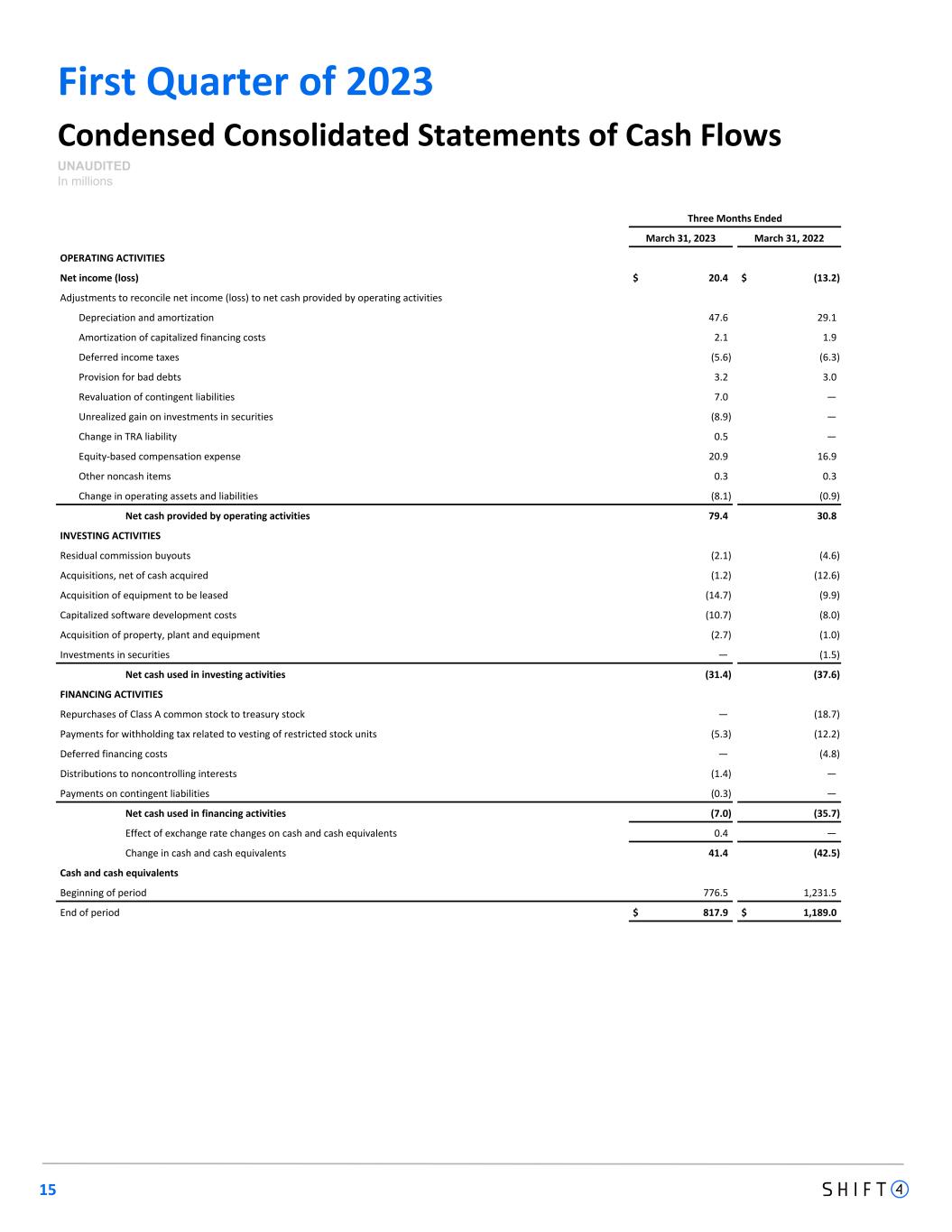 First Quarter of 2023 15 Condensed Consolidated Statements of Cash Flows UNAUDITED In millions Three Months Ended March 31, 2023 March 31, 2022 OPERATING ACTIVITIES Net income (loss) $ 20.4 $ (13.2) Adjustments to reconcile net income (loss) to net cash provided by operating activities Depreciation and amortization 47.6 29.1 Amortization of capitalized financing costs 2.1 1.9 Deferred income taxes (5.6) (6.3) Provision for bad debts 3.2 3.0 Revaluation of contingent liabilities 7.0 — Unrealized gain on investments in securities (8.9) — Change in TRA liability 0.5 — Equity-based compensation expense 20.9 16.9 Other noncash items 0.3 0.3 Change in operating assets and liabilities (8.1) (0.9) Net cash provided by operating activities 79.4 30.8 INVESTING ACTIVITIES Residual commission buyouts (2.1) (4.6) Acquisitions, net of cash acquired (1.2) (12.6) Acquisition of equipment to be leased (14.7) (9.9) Capitalized software development costs (10.7) (8.0) Acquisition of property, plant and equipment (2.7) (1.0) Investments in securities — (1.5) Net cash used in investing activities (31.4) (37.6) FINANCING ACTIVITIES Repurchases of Class A common stock to treasury stock — (18.7) Payments for withholding tax related to vesting of restricted stock units (5.3) (12.2) Deferred financing costs — (4.8) Distributions to noncontrolling interests (1.4) — Payments on contingent liabilities (0.3) — Net cash used in financing activities (7.0) (35.7) Effect of exchange rate changes on cash and cash equivalents 0.4 — Change in cash and cash equivalents 41.4 (42.5) Cash and cash equivalents Beginning of period 776.5 1,231.5 End of period $ 817.9 $ 1,189.0