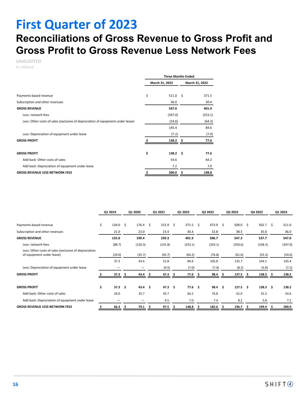First Quarter of 2023 Reconciliations of Gross Revenue to Gross Profit and Gross Profit to Gross Revenue Less Network Fees UNAUDITED In millions Three Months Ended March 31, 2023 March 31, 2022 Payments-based revenue $ 511.0 $ 371.5 Subscription and other revenues 36.0 30.4 GROSS REVENUE 547.0 401.9 Less: network fees (347.0) (253.1) Less: Other costs of sales (exclusive of depreciation of equipment under lease) (54.6) (64.2) 145.4 84.6 Less: Depreciation of equipment under lease (7.2) (7.0) GROSS PROFIT $ 138.2 $ 77.6 GROSS PROFIT $ 138.2 $ 77.6 Add back: Other costs of sales 54.6 64.2 Add back: Depreciation of equipment under lease 7.2 7.0 GROSS REVENUE LESS NETWORK FEES $ 200.0 $ 148.8 16 Q1 2019 Q1 2020 Q1 2021 Q1 2022 Q2 2022 Q3 2022 Q4 2022 Q1 2023 Payments-based revenue $ 134.0 $ 176.4 $ 215.9 $ 371.5 $ 473.9 $ 509.0 $ 502.7 $ 511.0 Subscription and other revenues 21.0 23.0 23.4 30.4 32.8 38.3 35.0 36.0 GROSS REVENUE 155.0 199.4 239.3 401.9 506.7 547.3 537.7 547.0 Less: network fees (88.7) (120.3) (141.8) (253.1) (324.1) (350.6) (338.3) (347.0) Less: Other costs of sales (exclusive of depreciation of equipment under lease) (29.0) (35.7) (45.7) (64.2) (76.8) (61.0) (55.3) (54.6) 37.3 43.4 51.8 84.6 105.8 135.7 144.1 145.4 Less: Depreciation of equipment under lease — — (4.5) (7.0) (7.4) (8.2) (5.8) (7.2) GROSS PROFIT $ 37.3 $ 43.4 $ 47.3 $ 77.6 $ 98.4 $ 127.5 $ 138.3 $ 138.2 GROSS PROFIT $ 37.3 $ 43.4 $ 47.3 $ 77.6 $ 98.4 $ 127.5 $ 138.3 $ 138.2 Add back: Other costs of sales 29.0 35.7 45.7 64.2 76.8 61.0 55.3 54.6 Add back: Depreciation of equipment under lease — — 4.5 7.0 7.4 8.2 5.8 7.2 GROSS REVENUE LESS NETWORK FEES $ 66.3 $ 79.1 $ 97.5 $ 148.8 $ 182.6 $ 196.7 $ 199.4 $ 200.0