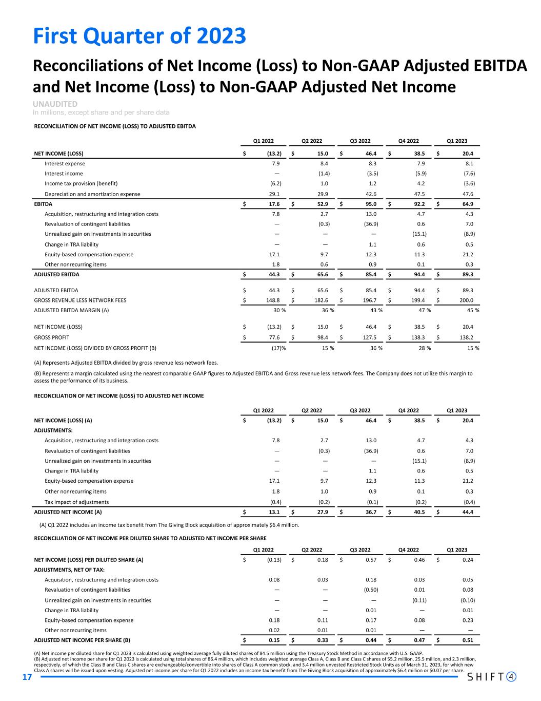 First Quarter of 2023 17 Reconciliations of Net Income (Loss) to Non-GAAP Adjusted EBITDA and Net Income (Loss) to Non-GAAP Adjusted Net Income UNAUDITED In millions, except share and per share data RECONCILIATION OF NET INCOME (LOSS) TO ADJUSTED EBITDA Q1 2022 Q2 2022 Q3 2022 Q4 2022 Q1 2023 NET INCOME (LOSS) $ (13.2) $ 15.0 $ 46.4 $ 38.5 $ 20.4 Interest expense 7.9 8.4 8.3 7.9 8.1 Interest income — (1.4) (3.5) (5.9) (7.6) Income tax provision (benefit) (6.2) 1.0 1.2 4.2 (3.6) Depreciation and amortization expense 29.1 29.9 42.6 47.5 47.6 EBITDA $ 17.6 $ 52.9 $ 95.0 $ 92.2 $ 64.9 Acquisition, restructuring and integration costs 7.8 2.7 13.0 4.7 4.3 Revaluation of contingent liabilities — (0.3) (36.9) 0.6 7.0 Unrealized gain on investments in securities — — — (15.1) (8.9) Change in TRA liability — — 1.1 0.6 0.5 Equity-based compensation expense 17.1 9.7 12.3 11.3 21.2 Other nonrecurring items 1.8 0.6 0.9 0.1 0.3 ADJUSTED EBITDA $ 44.3 $ 65.6 $ 85.4 $ 94.4 $ 89.3 ADJUSTED EBITDA $ 44.3 $ 65.6 $ 85.4 $ 94.4 $ 89.3 GROSS REVENUE LESS NETWORK FEES $ 148.8 $ 182.6 $ 196.7 $ 199.4 $ 200.0 ADJUSTED EBITDA MARGIN (A) 30 % 36 % 43 % 47 % 45 % NET INCOME (LOSS) $ (13.2) $ 15.0 $ 46.4 $ 38.5 $ 20.4 GROSS PROFIT $ 77.6 $ 98.4 $ 127.5 $ 138.3 $ 138.2 NET INCOME (LOSS) DIVIDED BY GROSS PROFIT (B) (17) % 15 % 36 % 28 % 15 % (A) Represents Adjusted EBITDA divided by gross revenue less network fees. (B) Represents a margin calculated using the nearest comparable GAAP figures to Adjusted EBITDA and Gross revenue less network fees. The Company does not utilize this margin to assess the performance of its business. RECONCILIATION OF NET INCOME (LOSS) TO ADJUSTED NET INCOME Q1 2022 Q2 2022 Q3 2022 Q4 2022 Q1 2023 NET INCOME (LOSS) (A) $ (13.2) $ 15.0 $ 46.4 $ 38.5 $ 20.4 ADJUSTMENTS: Acquisition, restructuring and integration costs 7.8 2.7 13.0 4.7 4.3 Revaluation of contingent liabilities — (0.3) (36.9) 0.6 7.0 Unrealized gain on investments in securities — — — (15.1) (8.9) Change in TRA liability — — 1.1 0.6 0.5 Equity-based compensation expense 17.1 9.7 12.3 11.3 21.2 Other nonrecurring items 1.8 1.0 0.9 0.1 0.3 Tax impact of adjustments (0.4) (0.2) (0.1) (0.2) (0.4) ADJUSTED NET INCOME (A) $ 13.1 $ 27.9 $ 36.7 $ 40.5 $ 44.4 (A) Q1 2022 includes an income tax benefit from The Giving Block acquisition of approximately $6.4 million. RECONCILIATION OF NET INCOME PER DILUTED SHARE TO ADJUSTED NET INCOME PER SHARE Q1 2022 Q2 2022 Q3 2022 Q4 2022 Q1 2023 NET INCOME (LOSS) PER DILUTED SHARE (A) $ (0.13) $ 0.18 $ 0.57 $ 0.46 $ 0.24 ADJUSTMENTS, NET OF TAX: Acquisition, restructuring and integration costs 0.08 0.03 0.18 0.03 0.05 Revaluation of contingent liabilities — — (0.50) 0.01 0.08 Unrealized gain on investments in securities — — — (0.11) (0.10) Change in TRA liability — — 0.01 — 0.01 Equity-based compensation expense 0.18 0.11 0.17 0.08 0.23 Other nonrecurring items 0.02 0.01 0.01 — — ADJUSTED NET INCOME PER SHARE (B) $ 0.15 $ 0.33 $ 0.44 $ 0.47 $ 0.51 (A) Net income per diluted share for Q1 2023 is calculated using weighted average fully diluted shares of 84.5 million using the Treasury Stock Method in accordance with U.S. GAAP. (B) Adjusted net income per share for Q1 2023 is calculated using total shares of 86.4 million, which includes weighted average Class A, Class B and Class C shares of 55.2 million, 25.5 million, and 2.3 million, respectively, of which the Class B and Class C shares are exchangeable/convertible into shares of Class A common stock, and 3.4 million unvested Restricted Stock Units as of March 31, 2023, for which new Class A shares will be issued upon vesting. Adjusted net income per share for Q1 2022 includes an income tax benefit from The Giving Block acquisition of approximately $6.4 million or $0.07 per share.