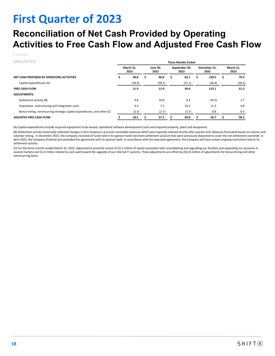 Three Months Ended March 31, 2022 June 30, 2022 September 30, 2022 December 31, 2022 March 31, 2023 NET CASH PROVIDED BY OPERATING ACTIVITIES $ 30.8 $ 40.0 $ 65.1 $ 139.5 $ 79.4 Capital expenditures (A) (18.9) (28.1) (31.1) (26.4) (28.1) FREE CASH FLOW 11.9 11.9 34.0 113.1 51.3 ADJUSTMENTS: Settlement activity (B) 4.8 10.8 4.3 (76.5) 1.7 Acquisition, restructuring and integration costs 4.3 7.2 10.2 11.3 4.8 Bonus timing, nonrecurring strategic capital expenditures, and other (C) (2.5) (2.7) (3.7) 8.8 0.5 ADJUSTED FREE CASH FLOW $ 18.5 $ 27.2 $ 44.8 $ 56.7 $ 58.3 Reconciliation of Net Cash Provided by Operating Activities to Free Cash Flow and Adjusted Free Cash Flow in millions UNAUDITED 18 First Quarter of 2023 (A) Capital expenditures include acquired equipment to be leased, capitalized software development costs and acquired property, plant and equipment. (B) Settlement activity historically reflected changes in the Company's accounts receivable balances which were typically relieved shortly after quarter-end. Balances fluctuated based on volume and calendar timing. In December 2022, the Company received all funds held in its sponsor bank merchant settlement account that were previously deposited to cover the net settlement overdraft. In April 2023, the Company finalized and amended the agreement with its sponsor bank. In accordance with the executed agreement, the Company will have certain ongoing restrictions tied to its settlement activity. (C) For the three months ended March 31, 2023, adjustments primarily consist of $2.1 million of spend associated with consolidating and upgrading our facilities and expanding our presence in several markets and $1.4 million related to cash paid toward the upgrade of our internal IT systems. These adjustments are offset by ($3.0) million of adjustments for bonus timing and other nonrecurring items.