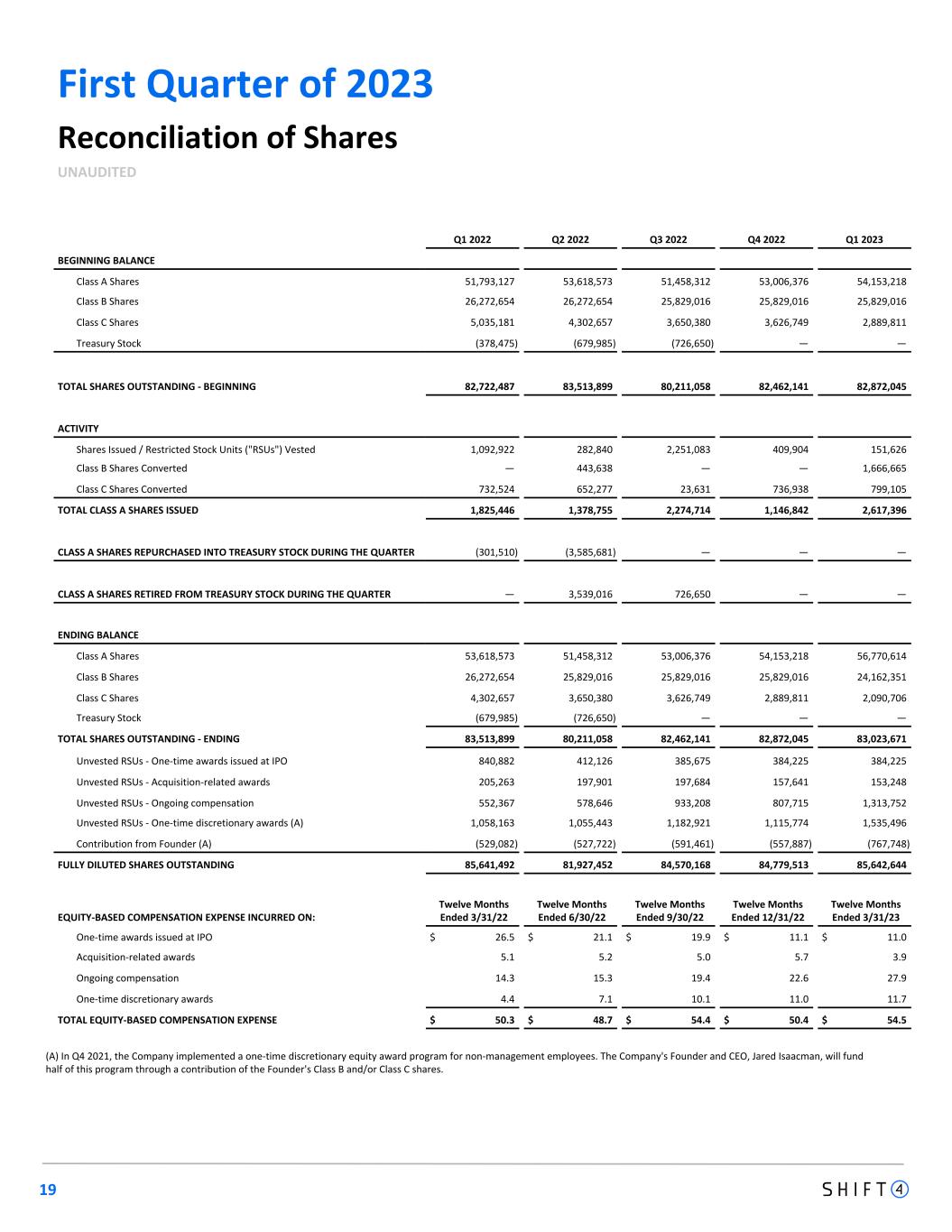 First Quarter of 2023 19 Reconciliation of Shares UNAUDITED Q1 2022 Q2 2022 Q3 2022 Q4 2022 Q1 2023 BEGINNING BALANCE Class A Shares 51,793,127 53,618,573 51,458,312 53,006,376 54,153,218 Class B Shares 26,272,654 26,272,654 25,829,016 25,829,016 25,829,016 Class C Shares 5,035,181 4,302,657 3,650,380 3,626,749 2,889,811 Treasury Stock (378,475) (679,985) (726,650) — — TOTAL SHARES OUTSTANDING - BEGINNING 82,722,487 83,513,899 80,211,058 82,462,141 82,872,045 ACTIVITY Shares Issued / Restricted Stock Units ("RSUs") Vested 1,092,922 282,840 2,251,083 409,904 151,626 Class B Shares Converted — 443,638 — — 1,666,665 Class C Shares Converted 732,524 652,277 23,631 736,938 799,105 TOTAL CLASS A SHARES ISSUED 1,825,446 1,378,755 2,274,714 1,146,842 2,617,396 CLASS A SHARES REPURCHASED INTO TREASURY STOCK DURING THE QUARTER (301,510) (3,585,681) — — — CLASS A SHARES RETIRED FROM TREASURY STOCK DURING THE QUARTER — 3,539,016 726,650 — — ENDING BALANCE Class A Shares 53,618,573 51,458,312 53,006,376 54,153,218 56,770,614 Class B Shares 26,272,654 25,829,016 25,829,016 25,829,016 24,162,351 Class C Shares 4,302,657 3,650,380 3,626,749 2,889,811 2,090,706 Treasury Stock (679,985) (726,650) — — — TOTAL SHARES OUTSTANDING - ENDING 83,513,899 80,211,058 82,462,141 82,872,045 83,023,671 Unvested RSUs - One-time awards issued at IPO 840,882 412,126 385,675 384,225 384,225 Unvested RSUs - Acquisition-related awards 205,263 197,901 197,684 157,641 153,248 Unvested RSUs - Ongoing compensation 552,367 578,646 933,208 807,715 1,313,752 Unvested RSUs - One-time discretionary awards (A) 1,058,163 1,055,443 1,182,921 1,115,774 1,535,496 Contribution from Founder (A) (529,082) (527,722) (591,461) (557,887) (767,748) FULLY DILUTED SHARES OUTSTANDING 85,641,492 81,927,452 84,570,168 84,779,513 85,642,644 EQUITY-BASED COMPENSATION EXPENSE INCURRED ON: Twelve Months Ended 3/31/22 Twelve Months Ended 6/30/22 Twelve Months Ended 9/30/22 Twelve Months Ended 12/31/22 Twelve Months Ended 3/31/23 One-time awards issued at IPO $ 26.5 $ 21.1 $ 19.9 $ 11.1 $ 11.0 Acquisition-related awards 5.1 5.2 5.0 5.7 3.9 Ongoing compensation 14.3 15.3 19.4 22.6 27.9 One-time discretionary awards 4.4 7.1 10.1 11.0 11.7 TOTAL EQUITY-BASED COMPENSATION EXPENSE $ 50.3 $ 48.7 $ 54.4 $ 50.4 $ 54.5 (A) In Q4 2021, the Company implemented a one-time discretionary equity award program for non-management employees. The Company's Founder and CEO, Jared Isaacman, will fund half of this program through a contribution of the Founder's Class B and/or Class C shares.
