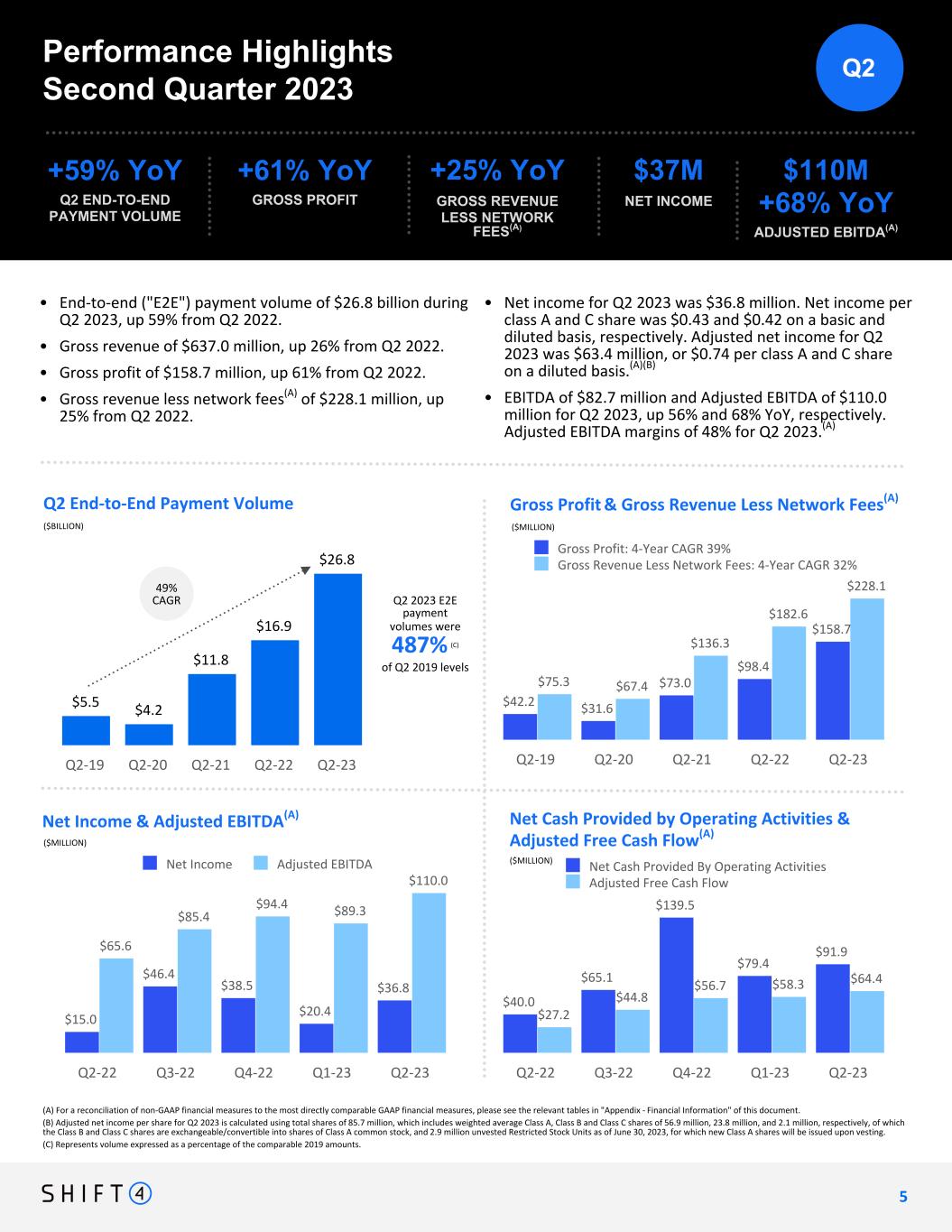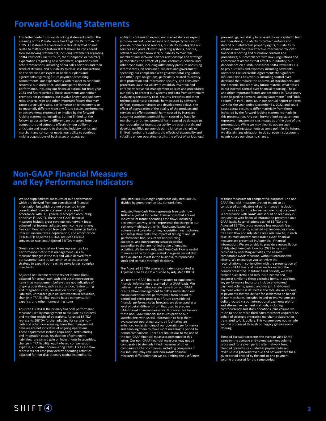 Non-GAAP Financial Measures and Key Performance Indicators Forward-Looking Statements We use supplemental measures of our performance which are derived from our consolidated financial information but which are not presented in our consolidated financial statements prepared in accordance with U.S. generally accepted accounting principles ("GAAP"). These non-GAAP financial measures include: gross revenue less network fees; adjusted net income; adjusted net income per share; free cash flow; adjusted free cash flow; earnings before interest, income taxes, depreciation, and amortization (“EBITDA”); Adjusted EBITDA, Adjusted EBITDA conversion rate; and Adjusted EBITDA margin. Gross revenue less network fees represents a key performance metric that management uses to measure changes in the mix and value derived from our customer base as we continue to execute our strategy to expand our reach to serve larger, complex merchants. Adjusted net income represents net income (loss) adjusted for certain non-cash and other nonrecurring items that management believes are not indicative of ongoing operations, such as acquisition, restructuring and integration costs, revaluation of contingent liabilities, unrealized gain on investments in securities, change in TRA liability, equity-based compensation expense, and other nonrecurring items. Adjusted EBITDA is the primary financial performance measure used by management to evaluate its business and monitor results of operations. Adjusted EBITDA represents EBITDA further adjusted for certain non- cash and other nonrecurring items that management believes are not indicative of ongoing operations. These adjustments include acquisition, restructuring and integration costs, revaluation of contingent liabilities, unrealized gain on investments in securities, change in TRA liability, equity-based compensation expense, and other nonrecurring items. Free cash flow represents net cash provided by operating activities adjusted for non-discretionary capital expenditures. This letter contains forward-looking statements within the meaning of the Private Securities Litigation Reform Act of 1995. All statements contained in this letter that do not relate to matters of historical fact should be considered forward-looking statements, including statements regarding Shift4 Payments, Inc.’s (“our”, the “Company” or "Shift4”) expectations regarding new customers; acquisitions and other transactions, including of our sales partners and their residual streams, and our ability to close said transactions on the timeline we expect or at all; our plans and agreements regarding future payment processing commitments; our expectations with respect to economic recovery; our stock price; and anticipated financial performance, including our financial outlook for fiscal year 2023 and future periods. These statements are neither promises nor guarantees, but involve known and unknown risks, uncertainties and other important factors that may cause our actual results, performance or achievements to be materially different from any future results, performance or achievements expressed or implied by the forward- looking statements, including, but not limited to, the following: our ability to differentiate ourselves from our competitors and compete effectively; our ability to anticipate and respond to changing industry trends and merchant and consumer needs; our ability to continue making acquisitions of businesses or assets; our Adjusted EBITDA Margin represents Adjusted EBITDA divided by gross revenue less network fees. Adjusted Free Cash Flow represents free cash flow further adjusted for certain transactions that are not indicative of future operating cash flows, including settlement activity, which represents the change in our settlement obligation, which fluctuated based on volumes and calendar timing, acquisition, restructuring and integration costs, the impact of timing of annual performance bonuses, other nonrecurring expenses, and nonrecurring strategic capital expenditures that are not indicative of ongoing activities. We believe Adjusted Free Cash Flow is useful to measure the funds generated in a given period that are available to invest in the business, to repurchase stock and to make strategic decisions. The Adjusted EBITDA conversion rate is calculated as Adjusted Free Cash Flow divided by Adjusted EBITDA. We use non-GAAP financial measures to supplement financial information presented on a GAAP basis. We believe that excluding certain items from our GAAP results allows management to better understand our consolidated financial performance from period to period and better project our future consolidated financial performance as forecasts are developed at a level of detail different from that used to prepare GAAP-based financial measures. Moreover, we believe these non-GAAP financial measures provide our stakeholders with useful information to help them evaluate our operating results by facilitating an enhanced understanding of our operating performance and enabling them to make more meaningful period to period comparisons. There are limitations to the use of the non-GAAP financial measures presented in this letter. Our non-GAAP financial measures may not be comparable to similarly titled measures of other companies. Other companies, including companies in our industry, may calculate non-GAAP financial measures differently than we do, limiting the usefulness ability to continue to expand our market share or expand into new markets; our reliance on third-party vendors to provide products and services; our ability to integrate our services and products with operating systems, devices, software and web browsers; our ability to maintain merchant and software partner relationships and strategic partnerships; the effects of global economic, political and other conditions, including inflationary pressure and rising interest rates, on consumer, business and government spending;