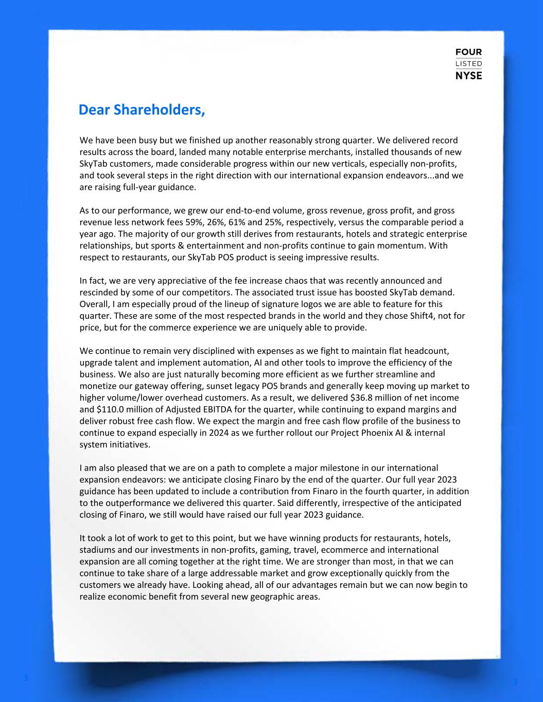 We have been busy but we finished up another reasonably strong quarter. We delivered record results across the board, landed many notable enterprise merchants, installed thousands of new SkyTab customers, made considerable progress within our new verticals, especially non-profits, and took several steps in the right direction with our international expansion endeavors...and we are raising full-year guidance. As to our performance, we grew our end-to-end volume, gross revenue, gross profit, and gross revenue less network fees 59%, 26%, 61% and 25%, respectively, versus the comparable period a year ago. The majority of our growth still derives from restaurants, hotels and strategic enterprise relationships, but sports & entertainment and non-profits continue to gain momentum. With respect to restaurants, our SkyTab POS product is seeing impressive results. In fact, we are very appreciative of the fee increase chaos that was recently announced and rescinded by some of our competitors. The associated trust issue has boosted SkyTab demand. Overall, I am especially proud of the lineup of signature logos we are able to feature for this quarter. These are some of the most respected brands in the world and they chose Shift4, not for price, but for the commerce experience we are uniquely able to provide. We continue to remain very disciplined with expenses as we fight to maintain flat headcount, upgrade talent and implement automation, AI and other tools to improve the efficiency of the business. We also are just naturally becoming more efficient as we further streamline and monetize our gateway offering, sunset legacy POS brands and generally keep moving up market to higher volume/lower overhead customers. As a result, we delivered $36.8 million of net income and $110.0 million of Adjusted EBITDA for the quarter, while continuing to expand margins and deliver robust free cash flow. We expect the margin and free cash flow profile of the business to continue to expand especially in 2024 as we further rollout our Project Phoenix AI & internal system initiatives. I am also pleased that we are on a path to complete a major milestone in our international expansion endeavors: we anticipate closing Finaro by the end of the quarter. Our full year 2023 guidance has been updated to include a contribution from Finaro in the fourth quarter, in addition to the outperformance we delivered this quarter. Said differently, irrespective of the anticipated closing of Finaro, we still would have raised our full year 2023 guidance. It took a lot of work to get to this point, but we have winning products for restaurants, hotels, stadiums and our investments in non-profits, gaming, travel, ecommerce and international expansion are all coming together at the right time. We are stronger than most, in that we can continue to take share of a large addressable market and grow exceptionally quickly from the customers we already have. Looking ahead, all of our advantages remain but we can now begin to realize economic benefit from several new geographic areas. Dear Shareholders, We have been busy but we finished up another reasonably strong quarter. We delivered record results across the board, landed many notable enterprise merchants, installed thousands of new SkyTab customers, made considerable progress within our new verticals, especially non-profits, and took several steps in the right direction with our international expansion endeavors...and we are raising full-year guidance. As to our performance, we grew our end-to-end volume, gross revenue, gross profit, and gross revenue less network fees 59%, 26%, 61% and 25%, respectively, versus the comparable period a year ago. The majority of our growth still derives from restaurants, hotels and strategic enterprise relationships, but sports & entertainment and non-profits continue to gain momentum. With respect to restaurants, our SkyTab POS product is seeing impressive results. In fact, we are very appreciative of the fee increase chaos that was recently announced and rescinded by some of our competitors. The associated trust issue has boosted SkyTab demand. Overall, I am especially proud of the lineup of signature logos we are able to feature for this quarter. These are some of the most respected brands in the world and they chose Shift4, not for price, but for the commerce experience we are uniquely able to provide. We continue to remain very disciplined with expenses as we fight to maintain flat headcount, upgrade talent and implement automation, AI and other tools to improve the efficiency of the business. We also are just naturally becoming more efficient as we further streamline and monetize our gateway offering, sunset legacy POS brands and generally keep moving up market to higher volume/lower overhead customers. As a result, we delivered $36.8 million of net income and $110.0 million of Adjusted EBITDA for the quarter, while continuing to expand margins and deliver robust free cash flow. We expect the margin and free cash flow profile of the business to continue to expand especially in 2024 as we further rollout our Project Phoenix AI & internal system initiatives. I am also pleased that we are on a path to complete a major milestone in our international expansion endeavors. Our guidance has been updated to reflect this milestone in addition to the organic acceleration we are seeing in the business including visibility into enterprise and international opportunities. It took a lot of work to get to this point, but we have winning products for restaurants, hotels, stadiums and our investments in non-profits, gaming, travel, ecommerce and international expansion are all coming together at the right time. We are stronger than most, in that we can continue to take share of a large addressable market and grow exceptionally quickly from the customers we already have. Looking ahead, all of our advantages remain but we can now begin to realize economic benefit from several n