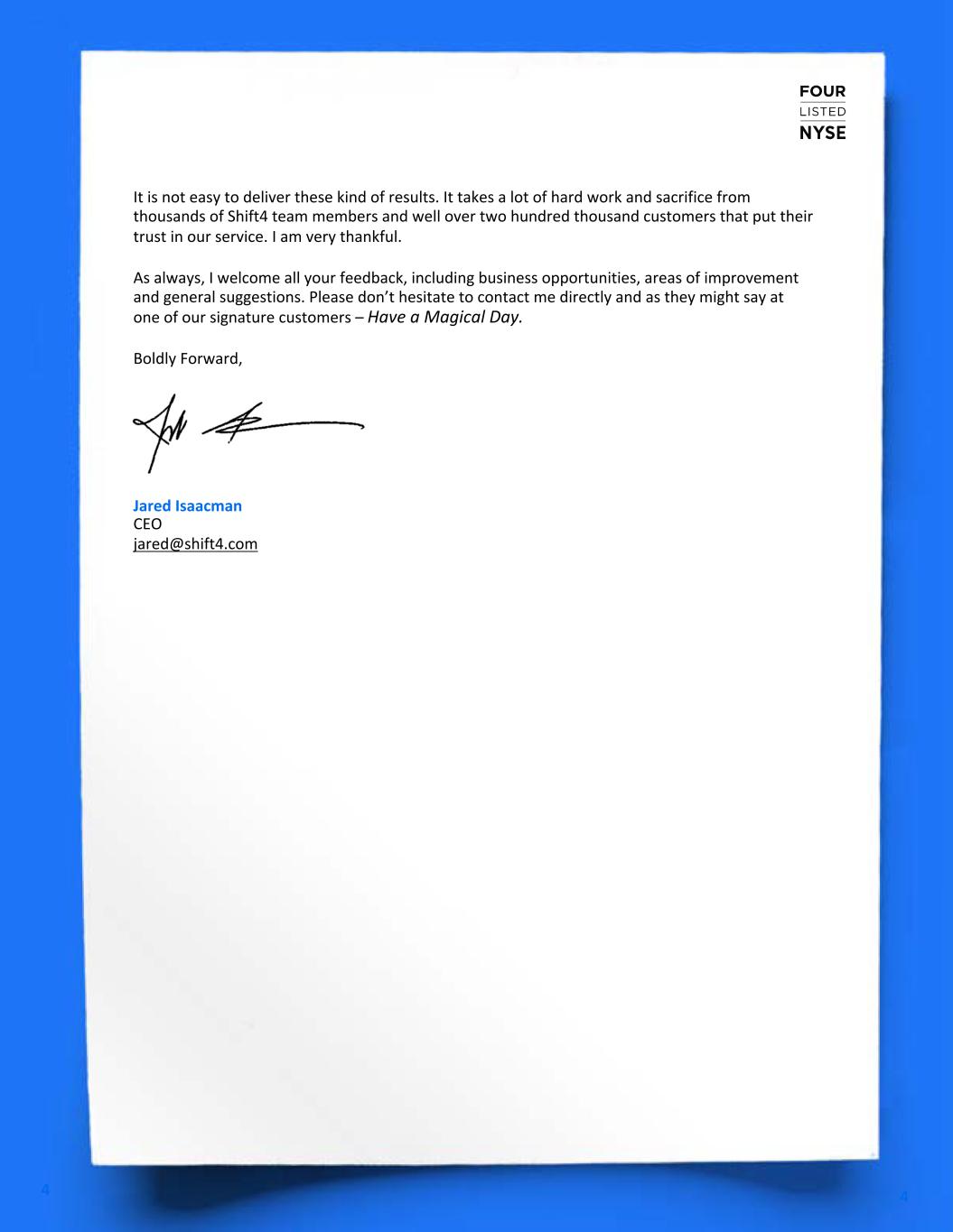 It is not easy to deliver these kind of results. It takes a lot of hard work and sacrifice from thousands of Shift4 team members and well over two hundred thousand customers that put their trust in our service. I am very thankful. As always, I welcome all your feedback, including business opportunities, areas of improvement and general suggestions. Please don’t hesitate to contact me directly and as they might say at one of our signature customers – Have a Magical Day. Boldly Forward, Jared Isaacman CEO jared@shift4.com 4 4