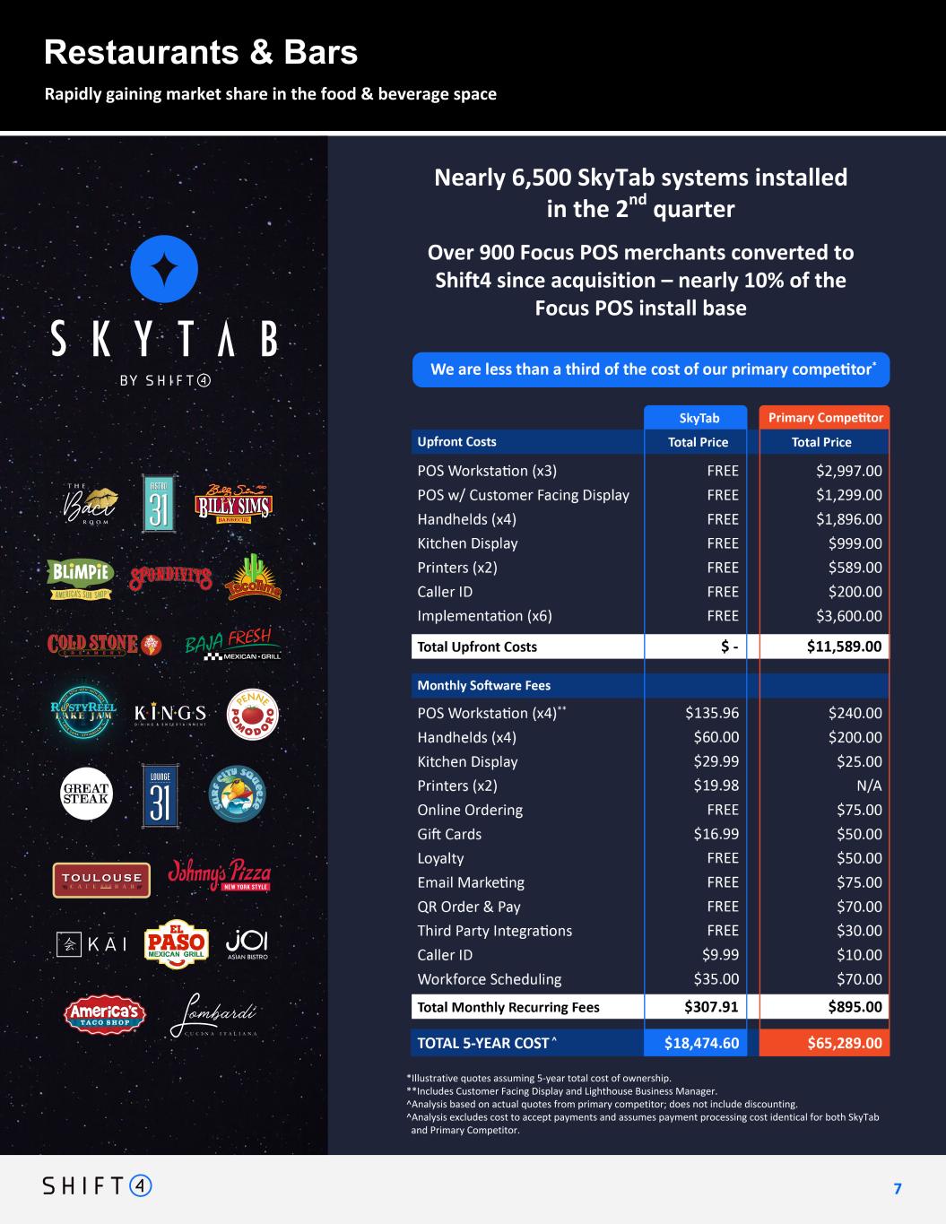 E2E Volumes and Blended Spreads by Quarter Gain Share & Steady Growth 5 Year Total Cost of Ownership Analysis High Growth Core: Gaining Share, Taking Out Parts Executing on Our Strategic Objectives (A) For Visa and MasterCard, 4-year CAGR volume based on US Payments Volume twelve months ended June 30, 2023 versus similar period ended June 30, 2019. Average size of merchant based on volume is +185% of 2021 levels. Move Up Market 6 6