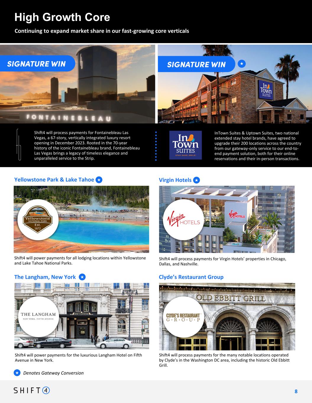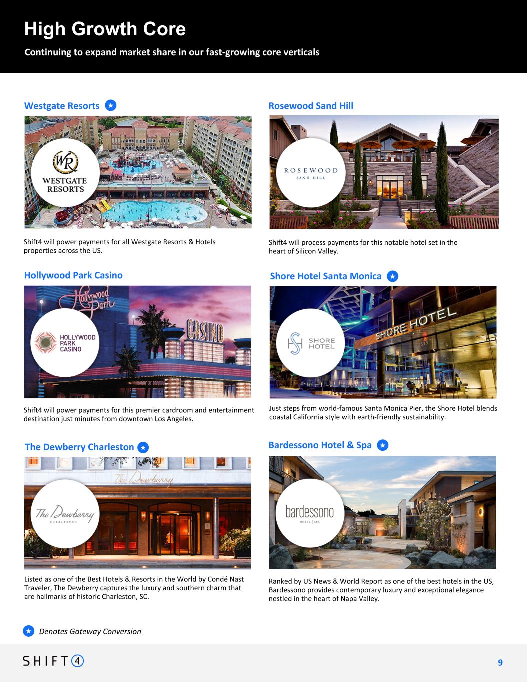 High Growth Core Continuing to expand market share in our fast-growing core verticals Denotes Gateway Conversion★ Shift4 will process payments for Virgin Hotels’ properties in Chicago, Dallas, and Nashville. Virgin Hotels Shift4 will power payments for the luxurious Langham Hotel on Fifth Avenue in New York. The Langham, New York Shift4 will process payments for the many notable locations operated by Clyde’s in the Washington DC area, including the historic Old Ebbitt Grill. Clyde’s Restaurant Group Shift4 will power payments for all lodging locations within Yellowstone and Lake Tahoe National Parks. Yellowstone Park & Lake Tahoe InTown Suites & Uptown Suites, two national extended stay hotel brands, have agreed to upgrade their 200 locations across the country from our gateway-only service to our end-to- end payment solution, both for their online reservations and their in-person transactions. Shift4 will process payments for Fontainebleau Las Vegas, a 67-story, vertically integrated luxury resort opening in December 2023. Rooted in the 70-year history of the iconic Fontainebleau brand, Fontainebleau Las Vegas brings a legacy of timeless elegance and unparalleled service to the Strip. ★ ★ ★ ★ 8 8