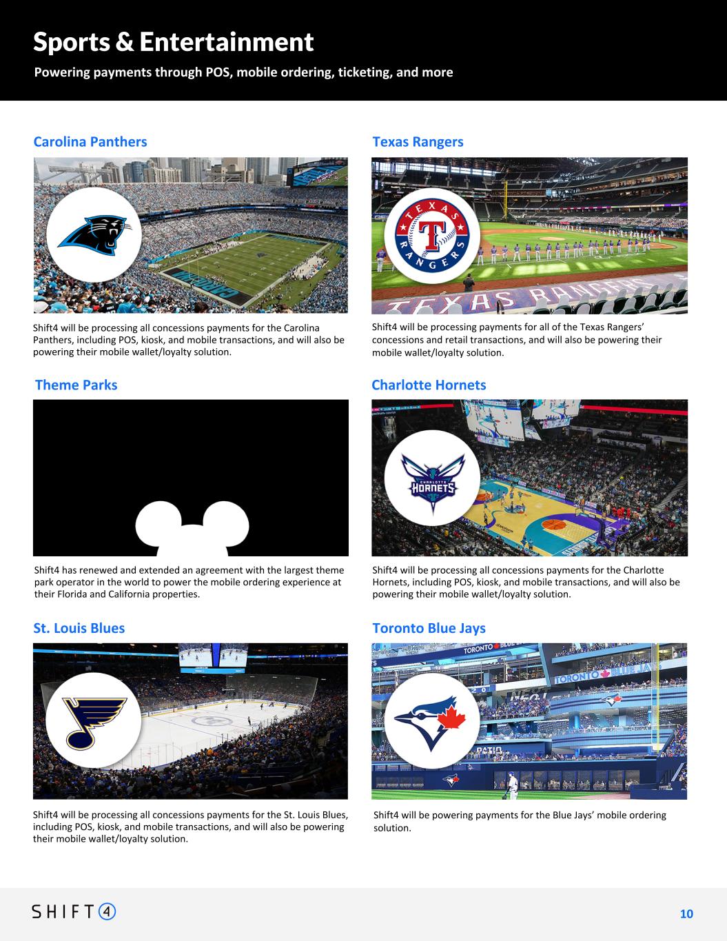 Sports & Entertainment Powering payments through POS, mobile ordering, ticketing, and more Theme Parks Shift4 will be processing all concessions payments for the St. Louis Blues, including POS, kiosk, and mobile transactions, and will also be powering their mobile wallet/loyalty solution. St. Louis Blues Charlotte Hornets Shift4 will be processing all concessions payments for the Charlotte Hornets, including POS, kiosk, and mobile transactions, and will also be powering their mobile wallet/loyalty solution. Shift4 will be processing all concessions payments for the Carolina Panthers, including POS, kiosk, and mobile transactions, and will also be powering their mobile wallet/loyalty solution. Carolina Panthers Texas Rangers Toronto Blue Jays Shift4 will be processing payments for all of the Texas Rangers’ concessions and retail transactions, and will also be powering their mobile wallet/loyalty solution. Shift4 will be powering payments for the Blue Jays’ mobile ordering solution. Shift4 has renewed and extended an agreement with the largest theme park operator in the world to power the mobile ordering experience at their Florida and California properties. 1 0 10