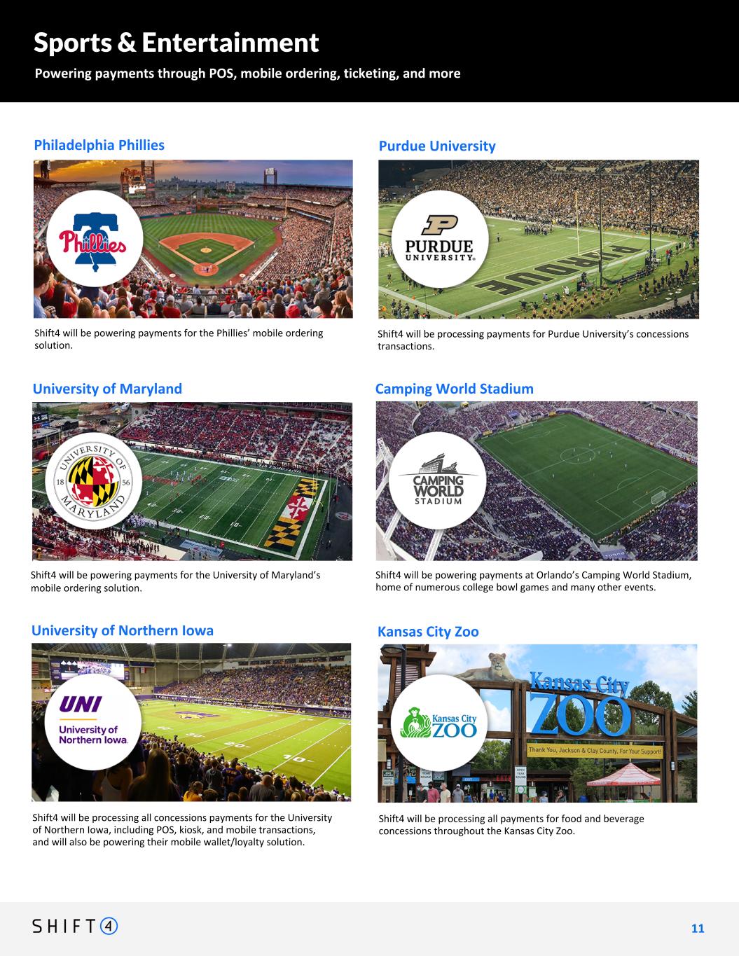 Sports & Entertainment Powering payments through POS, mobile ordering, ticketing, and more Shift4 will be processing payments for Purdue University’s concessions transactions. Purdue UniversityPhiladelphia Phillies Shift4 will be powering payments for the Phillies’ mobile ordering solution. University of Maryland Shift4 will be powering payments for the University of Maryland’s mobile ordering solution. 1 1 11 Camping World Stadium Shift4 will be powering payments at Orlando’s Camping World Stadium, home of numerous college bowl games and many other events. University of Northern Iowa Shift4 will be processing all concessions payments for the University of Northern Iowa, including POS, kiosk, and mobile transactions, and will also be powering their mobile wallet/loyalty solution. Kansas City Zoo Shift4 will be processing all payments for food and beverage concessions throughout the Kansas City Zoo.