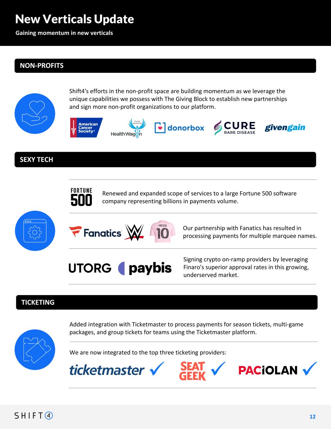 New Verticals Update Gaining momentum in new verticals 1 2 12 NON-PROFITS Added integration with Ticketmaster to process payments for season tickets, multi-game packages, and group tickets for teams using the Ticketmaster platform. Shift4's efforts in the non-profit space are building momentum as we leverage the unique capabilities we possess with The Giving Block to establish new partnerships and sign more non-profit organizations to our platform. Signing crypto on-ramp providers by leveraging Finaro's superior approval rates in this growing, underserved market. Renewed and expanded scope of services to a large Fortune 500 software company representing billions in payments volume. SEXY TECH TICKETING Our partnership with Fanatics has resulted in processing payments for multiple marquee names. We are now integrated to the top three ticketing providers: