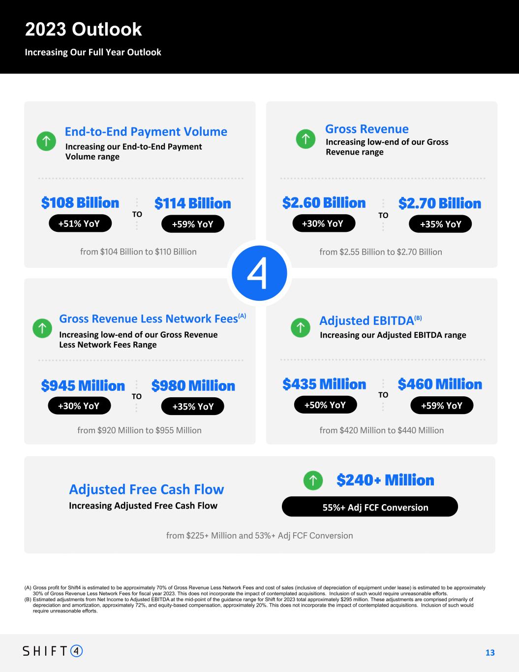 (A) Gross profit for Shift4 is estimated to be approximately 70% of Gross Revenue Less Network Fees and cost of sales (inclusive of depreciation of equipment under lease) is estimated to be approximately 30% of Gross Revenue Less Network Fees for fiscal year 2023. This does not incorporate the impact of contemplated acquisitions. Inclusion of such would require unreasonable efforts. (B) Estimated adjustments from Net Income to Adjusted EBITDA at the mid-point of the guidance range for Shift for 2023 total approximately $295 million. These adjustments are comprised primarily of depreciation and amortization, approximately 72%, and equity-based compensation, approximately 20%. This does not incorporate the impact of contemplated acquisitions. Inclusion of such would require unreasonable efforts. 2023 Outlook Increasing Our Full Year Outlook $108 Billion +51% YoY +59% YoY $114 Billion $2.60 Billion +30% YoY +35% YoY $2.70 Billion TO TO 55%+ Adj FCF Conversion $240+ Million Increasing our End-to-End Payment Volume range End-to-End Payment Volume Increasing low-end of our Gross Revenue range Gross Revenue Increasing low-end of our Gross Revenue Less Network Fees Range Gross Revenue Less Network Fees(A) TO $945 Million +30% YoY +35% YoY $980 Million Increasing our Adjusted EBITDA range Adjusted EBITDA(B) $435 Million +50% YoY +59% YoY $460 Million TO Increasing Adjusted Free Cash Flow Adjusted Free Cash Flow from $104 Billion to $110 Billion from $2.55 Billion to $2.70 Billion from $920 Million to $955 Million from $420 Million to $440 Million 1 3 13 from $225+ Million and 53%+ Adj FCF Conversion