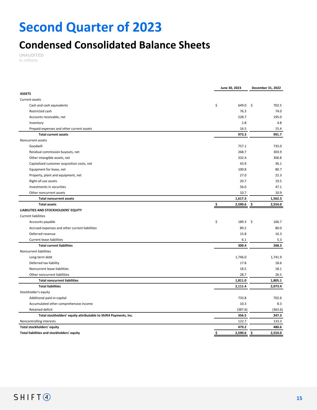 Second Quarter of 2023 Condensed Consolidated Balance Sheets UNAUDITED In millions June 30, 2023 December 31, 2022 ASSETS Current assets Cash and cash equivalents $ 649.0 $ 702.5 Restricted cash 76.3 74.0 Accounts receivable, net 228.7 195.0 Inventory 2.8 4.8 Prepaid expenses and other current assets 16.5 15.4 Total current assets 973.3 991.7 Noncurrent assets Goodwill 757.1 735.0 Residual commission buyouts, net 268.7 303.9 Other intangible assets, net 332.4 306.8 Capitalized customer acquisition costs, net 43.9 36.1 Equipment for lease, net 100.8 80.7 Property, plant and equipment, net 27.0 22.3 Right-of-use assets 20.7 19.5 Investments in securities 56.0 47.1 Other noncurrent assets 10.7 10.9 Total noncurrent assets 1,617.3 1,562.3 Total assets $ 2,590.6 $ 2,554.0 LIABILITIES AND STOCKHOLDERS' EQUITY Current liabilities Accounts payable $ 189.3 $ 166.7 Accrued expenses and other current liabilities 89.2 80.0 Deferred revenue 15.8 16.3 Current lease liabilities 6.1 5.3 Total current liabilities 300.4 268.3 Noncurrent liabilities Long-term debt 1,746.0 1,741.9 Deferred tax liability 17.8 18.6 Noncurrent lease liabilities 18.5 18.1 Other noncurrent liabilities 28.7 26.5 Total noncurrent liabilities 1,811.0 1,805.1 Total liabilities 2,111.4 2,073.4 Stockholder's equity Additional paid-in-capital 733.8 702.6 Accumulated other comprehensive income 10.3 8.3 Retained deficit (387.6) (363.6) Total stockholders' equity attributable to Shift4 Payments, Inc. 356.5 347.3 Noncontrolling interests 122.7 133.3 Total stockholders' equity 479.2 480.6 Total liabilities and stockholders' equity $ 2,590.6 $ 2,554.0 1 5 15