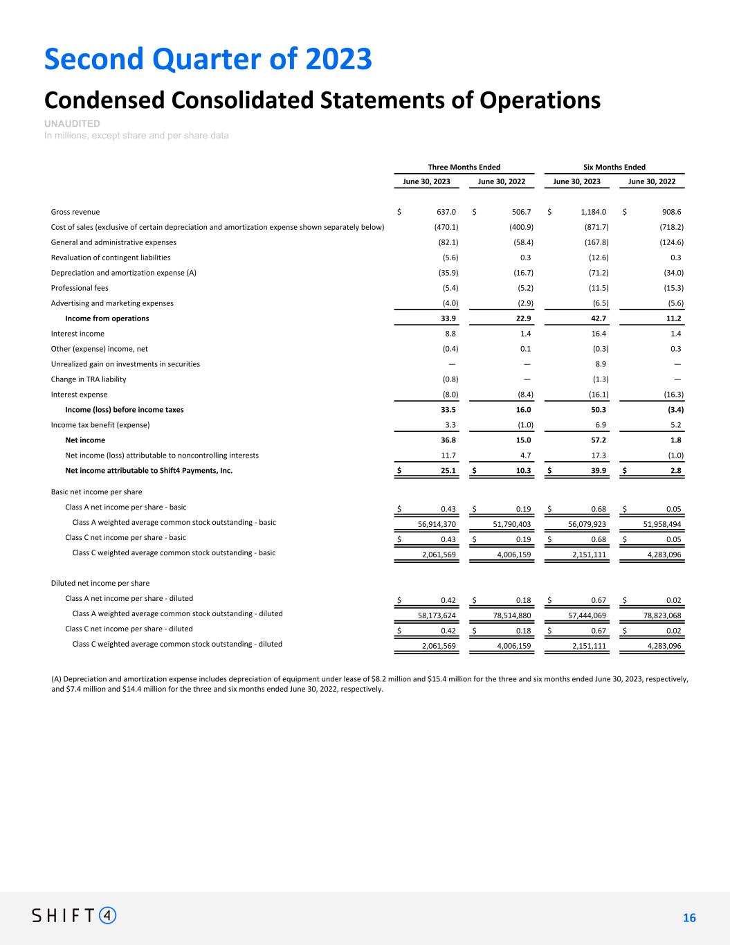 Second Quarter of 2023 Condensed Consolidated Statements of Operations UNAUDITED In millions, except share and per share data Three Months Ended Six Months Ended June 30, 2023 June 30, 2022 June 30, 2023 June 30, 2022 Gross revenue $ 637.0 $ 506.7 $ 1,184.0 $ 908.6 Cost of sales (exclusive of certain depreciation and amortization expense shown separately below) (470.1) (400.9) (871.7) (718.2) General and administrative expenses (82.1) (58.4) (167.8) (124.6) Revaluation of contingent liabilities (5.6) 0.3 (12.6) 0.3 Depreciation and amortization expense (A) (35.9) (16.7) (71.2) (34.0) Professional fees (5.4) (5.2) (11.5) (15.3) Advertising and marketing expenses (4.0) (2.9) (6.5) (5.6) Income from operations 33.9 22.9 42.7 11.2 Interest income 8.8 1.4 16.4 1.4 Other (expense) income, net (0.4) 0.1 (0.3) 0.3 Unrealized gain on investments in securities — — 8.9 — Change in TRA liability (0.8) — (1.3) — Interest expense (8.0) (8.4) (16.1) (16.3) Income (loss) before income taxes 33.5 16.0 50.3 (3.4) Income tax benefit (expense) 3.3 (1.0) 6.9 5.2 Net income 36.8 15.0 57.2 1.8 Net income (loss) attributable to noncontrolling interests 11.7 4.7 17.3 (1.0) Net income attributable to Shift4 Payments, Inc. $ 25.1 $ 10.3 $ 39.9 $ 2.8 Basic net income per share Class A net income per share - basic $ 0.43 $ 0.19 $ 0.68 $ 0.05 Class A weighted average common stock outstanding - basic 56,914,370 51,790,403 56,079,923 51,958,494 Class C net income per share - basic $ 0.43 $ 0.19 $ 0.68 $ 0.05 Class C weighted average common stock outstanding - basic 2,061,569 4,006,159 2,151,111 4,283,096 Diluted net income per share Class A net income per share - diluted $ 0.42 $ 0.18 $ 0.67 $ 0.02 Class A weighted average common stock outstanding - diluted 58,173,624 78,514,880 57,444,069 78,823,068 Class C net income per share - diluted $ 0.42 $ 0.18 $ 0.67 $ 0.02 Class C weighted average common stock outstanding - diluted 2,061,569 4,006,159 2,151,111 4,283,096 (A) Depreciation and amortization expense includes depreciation of equipment under lease of $8.2 million and $15.4 million for the three and six months ended June 30, 2023, respectively, and $7.4 million and $14.4 million for the three and six months ended June 30, 2022, respectively. 1 6 16