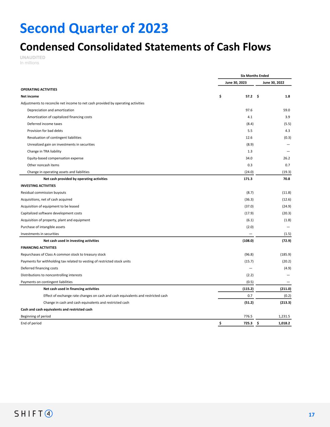 Second Quarter of 2023 Condensed Consolidated Statements of Cash Flows UNAUDITED In millions Six Months Ended June 30, 2023 June 30, 2022 OPERATING ACTIVITIES Net income $ 57.2 $ 1.8 Adjustments to reconcile net income to net cash provided by operating activities Depreciation and amortization 97.6 59.0 Amortization of capitalized financing costs 4.1 3.9 Deferred income taxes (8.4) (5.5) Provision for bad debts 5.5 4.3 Revaluation of contingent liabilities 12.6 (0.3) Unrealized gain on investments in securities (8.9) — Change in TRA liability 1.3 — Equity-based compensation expense 34.0 26.2 Other noncash items 0.3 0.7 Change in operating assets and liabilities (24.0) (19.3) Net cash provided by operating activities 171.3 70.8 INVESTING ACTIVITIES Residual commission buyouts (8.7) (11.8) Acquisitions, net of cash acquired (36.3) (12.6) Acquisition of equipment to be leased (37.0) (24.9) Capitalized software development costs (17.9) (20.3) Acquisition of property, plant and equipment (6.1) (1.8) Purchase of intangible assets (2.0) — Investments in securities — (1.5) Net cash used in investing activities (108.0) (72.9) FINANCING ACTIVITIES Repurchases of Class A common stock to treasury stock (96.8) (185.9) Payments for withholding tax related to vesting of restricted stock units (15.7) (20.2) Deferred financing costs — (4.9) Distributions to noncontrolling interests (2.2) — Payments on contingent liabilities (0.5) — Net cash used in financing activities (115.2) (211.0) Effect of exchange rate changes on cash and cash equivalents and restricted cash 0.7 (0.2) Change in cash and cash equivalents and restricted cash (51.2) (213.3) Cash and cash equivalents and restricted cash Beginning of period 776.5 1,231.5 End of period $ 725.3 $ 1,018.2 1 7 17