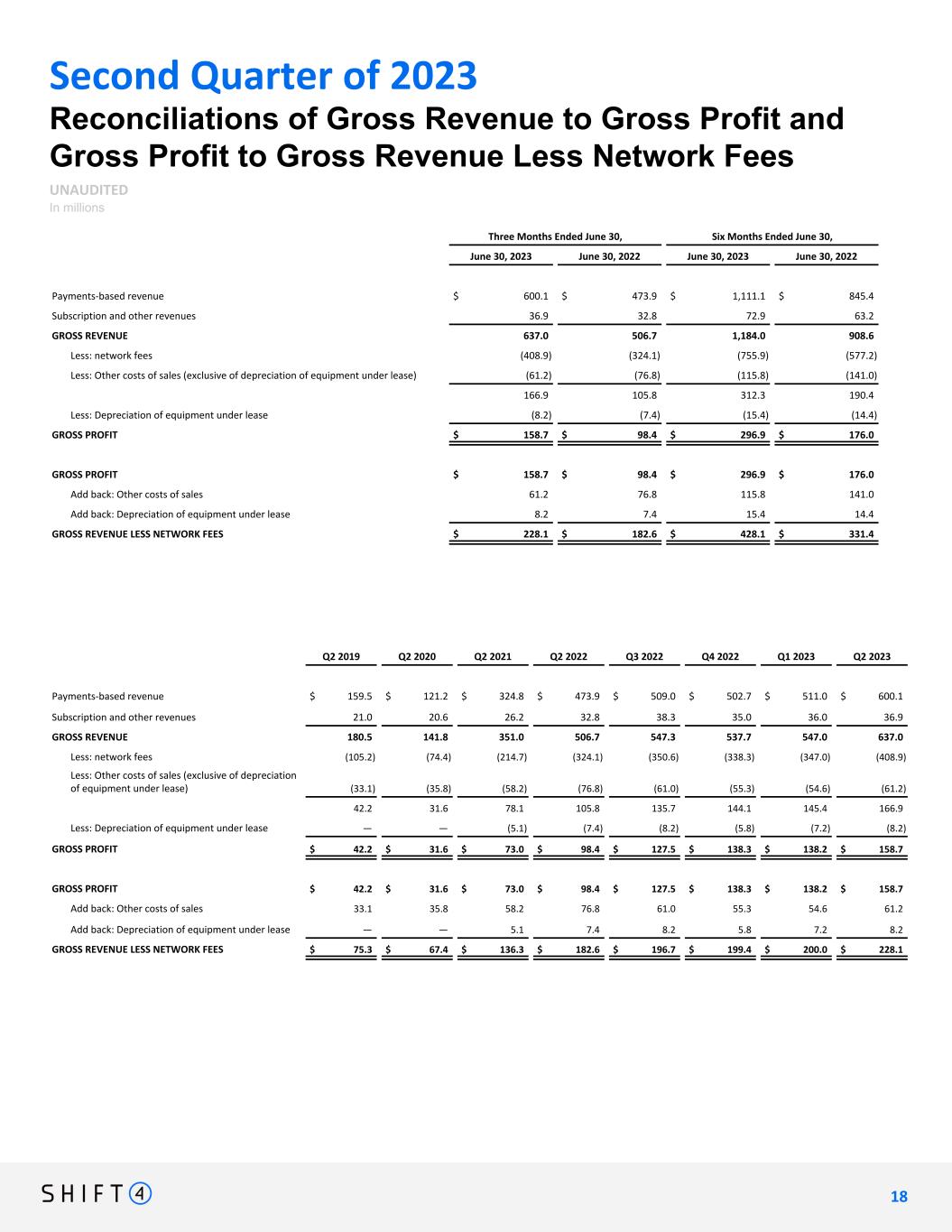 Second Quarter of 2023 Reconciliations of Gross Revenue to Gross Profit and Gross Profit to Gross Revenue Less Network Fees UNAUDITED In millions Three Months Ended June 30, Six Months Ended June 30, June 30, 2023 June 30, 2022 June 30, 2023 June 30, 2022 Payments-based revenue $ 600.1 $ 473.9 $ 1,111.1 $ 845.4 Subscription and other revenues 36.9 32.8 72.9 63.2 GROSS REVENUE 637.0 506.7 1,184.0 908.6 Less: network fees (408.9) (324.1) (755.9) (577.2) Less: Other costs of sales (exclusive of depreciation of equipment under lease) (61.2) (76.8) (115.8) (141.0) 166.9 105.8 312.3 190.4 Less: Depreciation of equipment under lease (8.2) (7.4) (15.4) (14.4) GROSS PROFIT $ 158.7 $ 98.4 $ 296.9 $ 176.0 GROSS PROFIT $ 158.7 $ 98.4 $ 296.9 $ 176.0 Add back: Other costs of sales 61.2 76.8 115.8 141.0 Add back: Depreciation of equipment under lease 8.2 7.4 15.4 14.4 GROSS REVENUE LESS NETWORK FEES $ 228.1 $ 182.6 $ 428.1 $ 331.4 Q2 2019 Q2 2020 Q2 2021 Q2 2022 Q3 2022 Q4 2022 Q1 2023 Q2 2023 Payments-based revenue $ 159.5 $ 121.2 $ 324.8 $ 473.9 $ 509.0 $ 502.7 $ 511.0 $ 600.1 Subscription and other revenues 21.0 20.6 26.2 32.8 38.3 35.0 36.0 36.9 GROSS REVENUE 180.5 141.8 351.0 506.7 547.3 537.7 547.0 637.0 Less: network fees (105.2) (74.4) (214.7) (324.1) (350.6) (338.3) (347.0) (408.9) Less: Other costs of sales (exclusive of depreciation of equipment under lease) (33.1) (35.8) (58.2) (76.8) (61.0) (55.3) (54.6) (61.2) 42.2 31.6 78.1 105.8 135.7 144.1 145.4 166.9 Less: Depreciation of equipment under lease — — (5.1) (7.4) (8.2) (5.8) (7.2) (8.2) GROSS PROFIT $ 42.2 $ 31.6 $ 73.0 $ 98.4 $ 127.5 $ 138.3 $ 138.2 $ 158.7 GROSS PROFIT $ 42.2 $ 31.6 $ 73.0 $ 98.4 $ 127.5 $ 138.3 $ 138.2 $ 158.7 Add back: Other costs of sales 33.1 35.8 58.2 76.8 61.0 55.3 54.6 61.2 Add back: Depreciation of equipment under lease — — 5.1 7.4 8.2 5.8 7.2 8.2 GROSS REVENUE LESS NETWORK FEES $ 75.3 $ 67.4 $ 136.3 $ 182.6 $ 196.7 $ 199.4 $ 200.0 $ 228.1 1 8 18