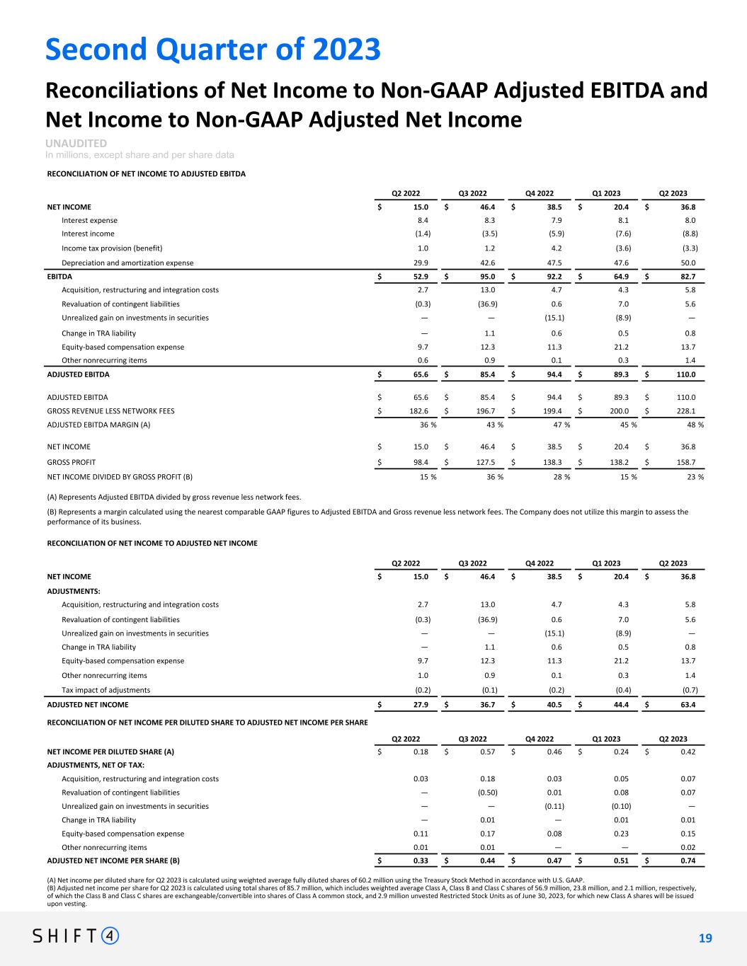Second Quarter of 2023 Reconciliations of Net Income to Non-GAAP Adjusted EBITDA and Net Income to Non-GAAP Adjusted Net Income UNAUDITED In millions, except share and per share data RECONCILIATION OF NET INCOME TO ADJUSTED EBITDA Q2 2022 Q3 2022 Q4 2022 Q1 2023 Q2 2023 NET INCOME $ 15.0 $ 46.4 $ 38.5 $ 20.4 $ 36.8 Interest expense 8.4 8.3 7.9 8.1 8.0 Interest income (1.4) (3.5) (5.9) (7.6) (8.8) Income tax provision (benefit) 1.0 1.2 4.2 (3.6) (3.3) Depreciation and amortization expense 29.9 42.6 47.5 47.6 50.0 EBITDA $ 52.9 $ 95.0 $ 92.2 $ 64.9 $ 82.7 Acquisition, restructuring and integration costs 2.7 13.0 4.7 4.3 5.8 Revaluation of contingent liabilities (0.3) (36.9) 0.6 7.0 5.6 Unrealized gain on investments in securities — — (15.1) (8.9) — Change in TRA liability — 1.1 0.6 0.5 0.8 Equity-based compensation expense 9.7 12.3 11.3 21.2 13.7 Other nonrecurring items 0.6 0.9 0.1 0.3 1.4 ADJUSTED EBITDA $ 65.6 $ 85.4 $ 94.4 $ 89.3 $ 110.0 ADJUSTED EBITDA $ 65.6 $ 85.4 $ 94.4 $ 89.3 $ 110.0 GROSS REVENUE LESS NETWORK FEES $ 182.6 $ 196.7 $ 199.4 $ 200.0 $ 228.1 ADJUSTED EBITDA MARGIN (A) 36 % 43 % 47 % 45 % 48 % NET INCOME $ 15.0 $ 46.4 $ 38.5 $ 20.4 $ 36.8 GROSS PROFIT $ 98.4 $ 127.5 $ 138.3 $ 138.2 $ 158.7 NET INCOME DIVIDED BY GROSS PROFIT (B) 15 % 36 % 28 % 15 % 23 % (A) Represents Adjusted EBITDA divided by gross revenue less network fees. (B) Represents a margin calculated using the nearest comparable GAAP figures to Adjusted EBITDA and Gross revenue less network fees. The Company does not utilize this margin to assess the performance of its business. RECONCILIATION OF NET INCOME TO ADJUSTED NET INCOME Q2 2022 Q3 2022 Q4 2022 Q1 2023 Q2 2023 NET INCOME $ 15.0 $ 46.4 $ 38.5 $ 20.4 $ 36.8 ADJUSTMENTS: Acquisition, restructuring and integration costs 2.7 13.0 4.7 4.3 5.8 Revaluation of contingent liabilities (0.3) (36.9) 0.6 7.0 5.6 Unrealized gain on investments in securities — — (15.1) (8.9) — Change in TRA liability — 1.1 0.6 0.5 0.8 Equity-based compensation expense 9.7 12.3 11.3 21.2 13.7 Other nonrecurring items 1.0 0.9 0.1 0.3 1.4 Tax impact of adjustments (0.2) (0.1) (0.2) (0.4) (0.7) ADJUSTED NET INCOME $ 27.9 $ 36.7 $ 40.5 $ 44.4 $ 63.4 RECONCILIATION OF NET INCOME PER DILUTED SHARE TO ADJUSTED NET INCOME PER SHARE Q2 2022 Q3 2022 Q4 2022 Q1 2023 Q2 2023 NET INCOME PER DILUTED SHARE (A) $ 0.18 $ 0.57 $ 0.46 $ 0.24 $ 0.42 ADJUSTMENTS, NET OF TAX: Acquisition, restructuring and integration costs 0.03 0.18 0.03 0.05 0.07 Revaluation of contingent liabilities — (0.50) 0.01 0.08 0.07 Unrealized gain on investments in securities — — (0.11) (0.10) — Change in TRA liability — 0.01 — 0.01 0.01 Equity-based compensation expense 0.11 0.17 0.08 0.23 0.15 Other nonrecurring items 0.01 0.01 — — 0.02 ADJUSTED NET INCOME PER SHARE (B) $ 0.33 $ 0.44 $ 0.47 $ 0.51 $ 0.74 (A) Net income per diluted share for Q2 2023 is calculated using weighted average fully diluted shares of 60.2 million using the Treasury Stock Method in accordance with U.S. GAAP. (B) Adjusted net income per share for Q2 2023 is calculated using total shares of 85.7 million, which includes weighted average Class A, Class B and Class C shares of 56.9 million, 23.8 million, and 2.1 million, respectively, of which the Class B and Class C shares are exchangeable/convertible into shares of Class A common stock, and 2.9 million unvested Restricted Stock Units as of June 30, 2023, for which new Class A shares will be issued upon vesting. 1 9 19