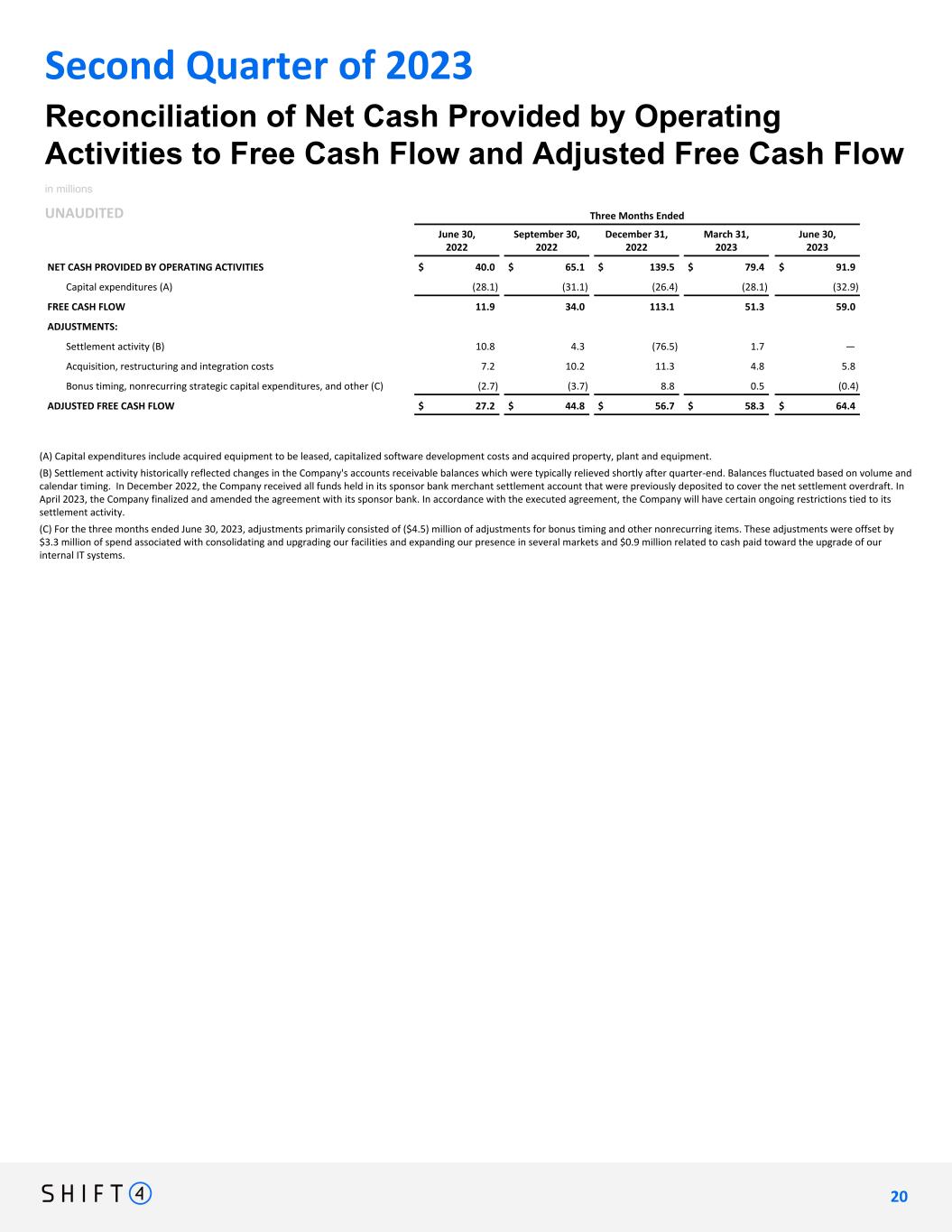 Three Months Ended June 30, 2022 September 30, 2022 December 31, 2022 March 31, 2023 June 30, 2023 NET CASH PROVIDED BY OPERATING ACTIVITIES $ 40.0 $ 65.1 $ 139.5 $ 79.4 $ 91.9 Capital expenditures (A) (28.1) (31.1) (26.4) (28.1) (32.9) FREE CASH FLOW 11.9 34.0 113.1 51.3 59.0 ADJUSTMENTS: Settlement activity (B) 10.8 4.3 (76.5) 1.7 — Acquisition, restructuring and integration costs 7.2 10.2 11.3 4.8 5.8 Bonus timing, nonrecurring strategic capital expenditures, and other (C) (2.7) (3.7) 8.8 0.5 (0.4) ADJUSTED FREE CASH FLOW $ 27.2 $ 44.8 $ 56.7 $ 58.3 $ 64.4 Reconciliation of Net Cash Provided by Operating Activities to Free Cash Flow and Adjusted Free Cash Flow in millions UNAUDITED Second Quarter of 2023 (A) Capital expenditures include acquired equipment to be leased, capitalized software development costs and acquired property, plant and equipment. (B) Settlement activity historically reflected changes in the Company's accounts receivable balances which were typically relieved shortly after quarter-end. Balances fluctuated based on volume and calendar timing. In December 2022, the Company received all funds held in its sponsor bank merchant settlement account that were previously deposited to cover the net settlement overdraft. In April 2023, the Company finalized and amended the agreement with its sponsor bank. In accordance with the executed agreement, the Company will have certain ongoing restrictions tied to its settlement activity. (C) For the three months ended June 30, 2023, adjustments primarily consisted of ($4.5) million of adjustments for bonus timing and other nonrecurring items. These adjustments were offset by $3.3 million of spend associated with consolidating and upgrading our facilities and expanding our presence in several markets and $0.9 million related to cash paid toward the upgrade of our internal IT systems. 2 0 20