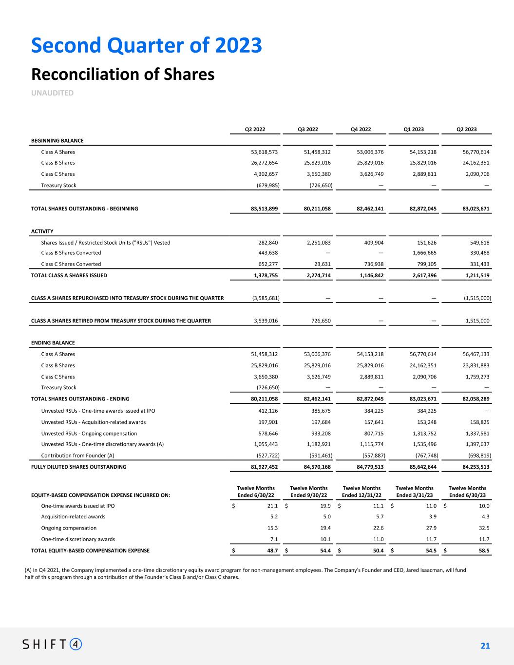 Second Quarter of 2023 Reconciliation of Shares UNAUDITED Q2 2022 Q3 2022 Q4 2022 Q1 2023 Q2 2023 BEGINNING BALANCE Class A Shares 53,618,573 51,458,312 53,006,376 54,153,218 56,770,614 Class B Shares 26,272,654 25,829,016 25,829,016 25,829,016 24,162,351 Class C Shares 4,302,657 3,650,380 3,626,749 2,889,811 2,090,706 Treasury Stock (679,985) (726,650) — — — TOTAL SHARES OUTSTANDING - BEGINNING 83,513,899 80,211,058 82,462,141 82,872,045 83,023,671 ACTIVITY Shares Issued / Restricted Stock Units ("RSUs") Vested 282,840 2,251,083 409,904 151,626 549,618 Class B Shares Converted 443,638 — — 1,666,665 330,468 Class C Shares Converted 652,277 23,631 736,938 799,105 331,433 TOTAL CLASS A SHARES ISSUED 1,378,755 2,274,714 1,146,842 2,617,396 1,211,519 CLASS A SHARES REPURCHASED INTO TREASURY STOCK DURING THE QUARTER (3,585,681) — — — (1,515,000) CLASS A SHARES RETIRED FROM TREASURY STOCK DURING THE QUARTER 3,539,016 726,650 — — 1,515,000 ENDING BALANCE Class A Shares 51,458,312 53,006,376 54,153,218 56,770,614 56,467,133 Class B Shares 25,829,016 25,829,016 25,829,016 24,162,351 23,831,883 Class C Shares 3,650,380 3,626,749 2,889,811 2,090,706 1,759,273 Treasury Stock (726,650) — — — — TOTAL SHARES OUTSTANDING - ENDING 80,211,058 82,462,141 82,872,045 83,023,671 82,058,289 Unvested RSUs - One-time awards issued at IPO 412,126 385,675 384,225 384,225 — Unvested RSUs - Acquisition-related awards 197,901 197,684 157,641 153,248 158,825 Unvested RSUs - Ongoing compensation 578,646 933,208 807,715 1,313,752 1,337,581 Unvested RSUs - One-time discretionary awards (A) 1,055,443 1,182,921 1,115,774 1,535,496 1,397,637 Contribution from Founder (A) (527,722) (591,461) (557,887) (767,748) (698,819) FULLY DILUTED SHARES OUTSTANDING 81,927,452 84,570,168 84,779,513 85,642,644 84,253,513 EQUITY-BASED COMPENSATION EXPENSE INCURRED ON: Twelve Months Ended 6/30/22 Twelve Months Ended 9/30/22 Twelve Months Ended 12/31/22 Twelve Months Ended 3/31/23 Twelve Months Ended 6/30/23 One-time awards issued at IPO $ 21.1 $ 19.9 $ 11.1 $ 11.0 $ 10.0 Acquisition-related awards 5.2 5.0 5.7 3.9 4.3 Ongoing compensation 15.3 19.4 22.6 27.9 32.5 One-time discretionary awards 7.1 10.1 11.0 11.7 11.7 TOTAL EQUITY-BASED COMPENSATION EXPENSE $ 48.7 $ 54.4 $ 50.4 $ 54.5 $ 58.5 (A) In Q4 2021, the Company implemented a one-time discretionary equity award program for non-management employees. The Company's Founder and CEO, Jared Isaacman, will fund half of this program through a contribution of the Founder's Class B and/or Class C shares. 2 1 21