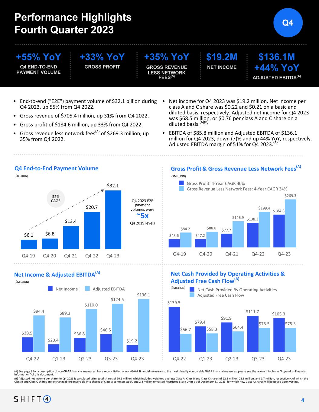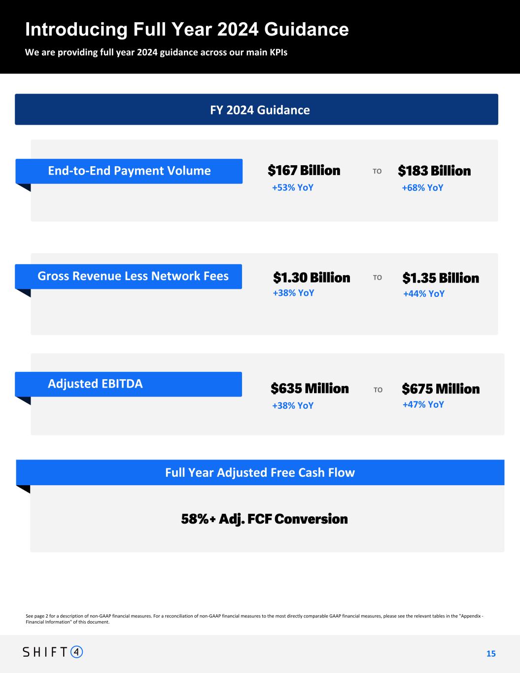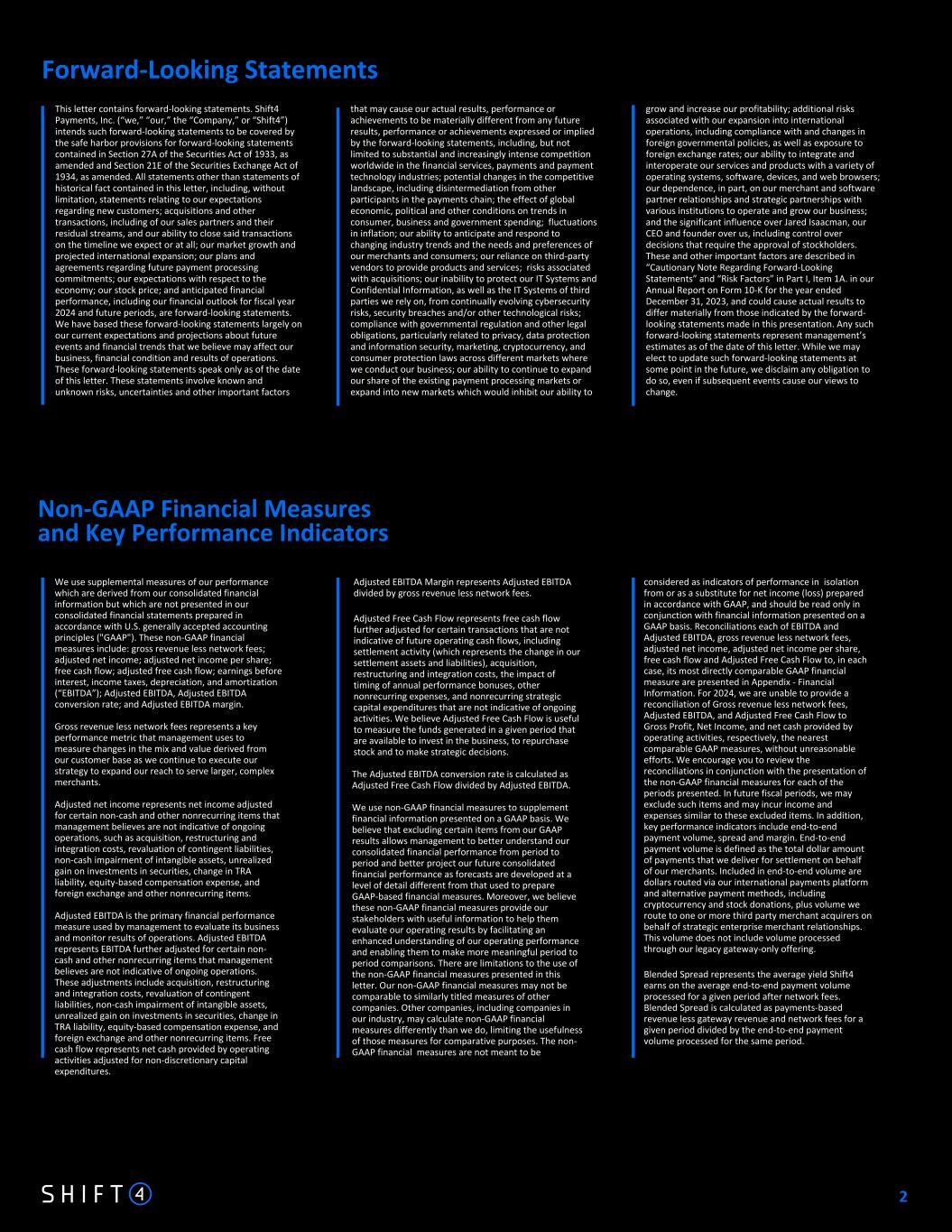 Non-GAAP Financial Measures and Key Performance Indicators Forward-Looking Statements We use supplemental measures of our performance which are derived from our consolidated financial information but which are not presented in our consolidated financial statements prepared in accordance with U.S. generally accepted accounting principles ("GAAP"). These non-GAAP financial measures include: gross revenue less network fees; adjusted net income; adjusted net income per share; free cash flow; adjusted free cash flow; earnings before interest, income taxes, depreciation, and amortization (“EBITDA”); Adjusted EBITDA, Adjusted EBITDA conversion rate; and Adjusted EBITDA margin. Gross revenue less network fees represents a key performance metric that management uses to measure changes in the mix and value derived from our customer base as we continue to execute our strategy to expand our reach to serve larger, complex merchants. Adjusted net income represents net income adjusted for certain non-cash and other nonrecurring items that management believes are not indicative of ongoing operations, such as acquisition, restructuring and integration costs, revaluation of contingent liabilities, non-cash impairment of intangible assets, unrealized gain on investments in securities, change in TRA liability, equity-based compensation expense, and foreign exchange and other nonrecurring items. Adjusted EBITDA is the primary financial performance measure used by management to evaluate its business and monitor results of operations. Adjusted EBITDA represents EBITDA further adjusted for certain non- cash and other nonrecurring items that management believes are not indicative of ongoing operations. These adjustments include acquisition, restructuring and integration costs, revaluation of contingent liabilities, non-cash impairment of intangible assets, unrealized gain on investments in securities, change in TRA liability, equity-based compensation expense, and foreign exchange and other nonrecurring items. Free cash flow represents net cash provided by operating activities adjusted for non-discretionary capital expenditures. This letter contains forward-looking statements. Shift4 Payments, Inc. (“we,” “our,” the “Company,” or “Shift4”) intends such forward-looking statements to be covered by the safe harbor provisions for forward-looking statements contained in Section 27A of the Securities Act of 1933, as amended and Section 21E of the Securities Exchange Act of 1934, as amended. All statements other than statements of historical fact contained in this letter, including, without limitation, statements relating to our expectations regarding new customers; acquisitions and other transactions, including of our sales partners and their residual streams, and our ability to close said transactions on the timeline we expect or at all; our market growth and projected international expansion; our plans and agreements regarding future payment processing commitments; our expectations with respect to the economy; our stock price; and anticipated financial performance, including our financial outlook for fiscal year 2024 and future periods, are forward-looking statements. We have based these forward-looking statements largely on our current expectations and projections about future events and financial trends that we believe may affect our business, financial condition and results of operations. These forward-looking statements speak only as of the date of this letter. These statements involve known and unknown risks, uncertainties and other important factors Adjusted EBITDA Margin represents Adjusted EBITDA divided by gross revenue less network fees. Adjusted Free Cash Flow represents free cash flow further adjusted for certain transactions that are not indicative of future operating cash flows, including settlement activity (which represents the change in our settlement assets and liabilities), acquisition, restructuring and integration costs, the impact of timing of annual performance bonuses, other nonrecurring expenses, and nonrecurring strategic capital expenditures that are not indicative of ongoing activities. We believe Adjusted Free Cash Flow is useful to measure the funds generated in a given period that are available to invest in the business, to repurchase stock and to make strategic decisions. The Adjusted EBITDA conversion rate is calculated as Adjusted Free Cash Flow divided by Adjusted EBITDA. We use non-GAAP financial measures to supplement financial information presented on a GAAP basis. We believe that excluding certain items from our GAAP results allows management to better understand our consolidated financial performance from period to period and better project our future consolidated financial performance as forecasts are developed at a level of detail different from that used to prepare GAAP-based financial measures. Moreover, we believe these non-GAAP financial measures provide our stakeholders with useful information to help them evaluate our operating results by facilitating an enhanced understanding of our operating performance and enabling them to make more meaningful period to period comparisons. There are limitations to the use of the non-GAAP financial measures presented in this letter. Our non-GAAP financial measures may not be comparable to similarly titled measures of other companies. Other companies, including companies in our industry, may calculate non-GAAP financial measures differently than we do, limiting the usefulness of those measures for comparative purposes. The non- GAAP financial measures are not meant to be that may cause our actual results, performance or achievements to be materially different from any future results, performance or achievements expressed or implied by the forward-looking statements, including, but not limited to substantial and increasingly intense competition worldwide in the financial services, payments and payment technology ind