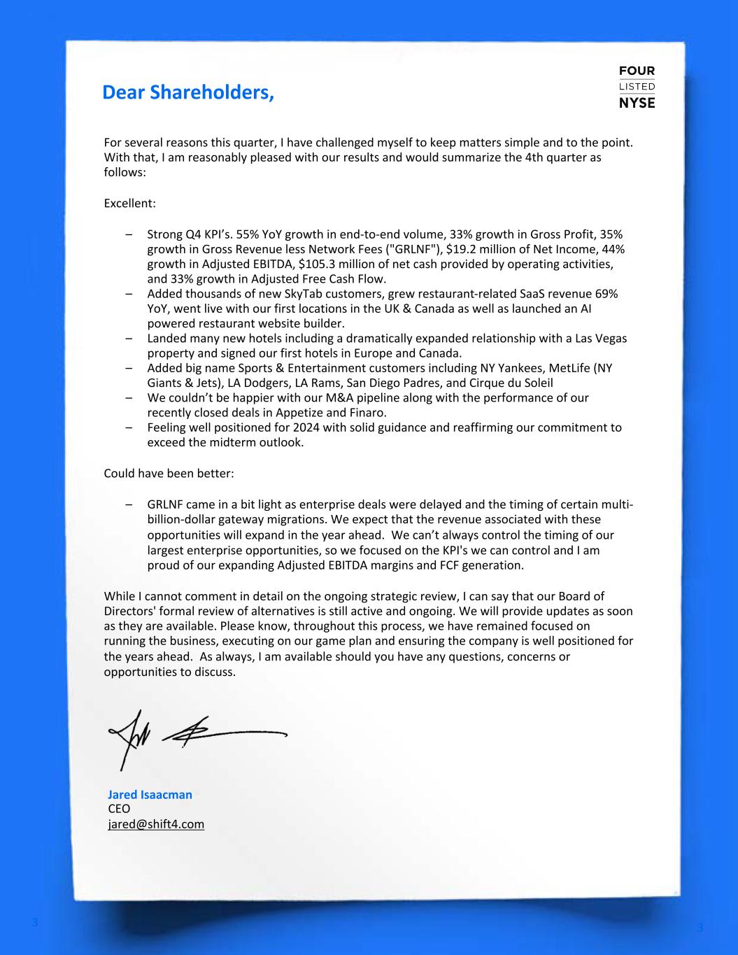 Dear Shareholders, 3 3 Jared Isaacman CEO jared@shift4.com For several reasons this quarter, I have challenged myself to keep matters simple and to the point. With that, I am reasonably pleased with our results and would summarize the 4th quarter as follows: Excellent: – Strong Q4 KPI’s. 55% YoY growth in end-to-end volume, 33% growth in Gross Profit, 35% growth in Gross Revenue less Network Fees ("GRLNF"), $19.2 million of Net Income, 44% growth in Adjusted EBITDA, $105.3 million of net cash provided by operating activities, and 33% growth in Adjusted Free Cash Flow. – Added thousands of new SkyTab customers, grew restaurant-related SaaS revenue 69% YoY, went live with our first locations in the UK & Canada as well as launched an AI powered restaurant website builder. – Landed many new hotels including a dramatically expanded relationship with a Las Vegas property and signed our first hotels in Europe and Canada. – Added big name Sports & Entertainment customers including NY Yankees, MetLife (NY Giants & Jets), LA Dodgers, LA Rams, San Diego Padres, and Cirque du Soleil – We couldn’t be happier with our M&A pipeline along with the performance of our recently closed deals in Appetize and Finaro. – Feeling well positioned for 2024 with solid guidance and reaffirming our commitment to exceed the midterm outlook. Could have been better: – GRLNF came in a bit light as enterprise deals were delayed and the timing of certain multi- billion-dollar gateway migrations. We expect that the revenue associated with these opportunities will expand in the year ahead. We can’t always control the timing of our largest enterprise opportunities, so we focused on the KPI's we can control and I am proud of our expanding Adjusted EBITDA margins and FCF generation. While I cannot comment in detail on the ongoing strategic review, I can say that our Board of Directors' formal review of alternatives is still active and ongoing. We will provide updates as soon as they are available. Please know, throughout this process, we have remained focused on running the business, executing on our game plan and ensuring the company is well positioned for the years ahead. As always, I am available should you have any questions, concerns or opportunities to discuss.