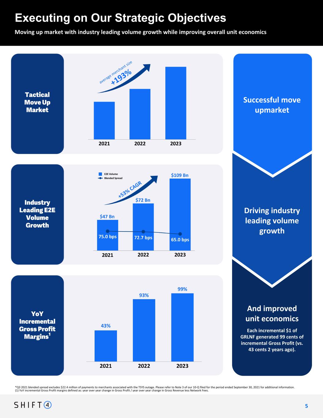 Q4 2023 E2E payment volumes were ~5x Q4 2019 levels $6.1 $6.8 $13.4 $20.7 $32.1 Q4-19 Q4-20 Q4-21 Q4-22 Q4-23 (A) See page 2 for a description of non-GAAP financial measures. For a reconciliation of non-GAAP financial measures to the most directly comparable GAAP financial measures, please see the relevant tables in "Appendix - Financial Information" of this document. (B) Adjusted net income per share for Q4 2023 is calculated using total shares of 90.1 million, which includes weighted average Class A, Class B and Class C shares of 62.3 million, 23.8 million, and 1.7 million, respectively, of which the Class B and Class C shares are exchangeable/convertible into shares of Class A common stock, and 2.3 million unvested Restricted Stock Units as of December 31, 2023, for which new Class A shares will be issued upon vesting. 4 Q4 End-to-End Payment Volume Gross Profit & Gross Revenue Less Network Fees(A) ($BILLION) Performance Highlights Fourth Quarter 2023 +55% YoY Q4 END-TO-END PAYMENT VOLUME 52% CAGR Net Income & Adjusted EBITDA(A) Net Cash Provided by Operating Activities & Adjusted Free Cash Flow(A) ($MILLION) ($MILLION) ($MILLION) +33% YoY GROSS PROFIT $19.2M NET INCOME • $136.1M +44% YoY ADJUSTED EBITDA(A) +35% YoY GROSS REVENUE LESS NETWORK FEES(A) • End-to-end ("E2E") payment volume of $32.1 billion during Q4 2023, up 55% from Q4 2022. • Gross revenue of $705.4 million, up 31% from Q4 2022. • Gross profit of $184.6 million, up 33% from Q4 2022. • Gross revenue less network fees(A) of $269.3 million, up 35% from Q4 2022. • Net income for Q4 2023 was $19.2 million. Net income per class A and C share was $0.22 and $0.21 on a basic and diluted basis, respectively. Adjusted net income for Q4 2023 was $68.5 million, or $0.76 per class A and C share on a diluted basis.(A)(B) • EBITDA of $85.8 million and Adjusted EBITDA of $136.1 million for Q4 2023, down (7)% and up 44% YoY, respectively. Adjusted EBITDA margin of 51% for Q4 2023.(A) Q4 4 $38.5 $20.4 $36.8 $46.5 $19.2 $94.4 $89.3 $110.0 $124.5 $136.1 Net Income Adjusted EBITDA Q4-22 Q1-23 Q2-23 Q3-23 Q4-23 $48.6 $47.2 $77.7 $138.3 $184.6 $84.2 $88.8 $146.9 $199.4 $269.3 Gross Profit: 4-Year CAGR 40% Gross Revenue Less Network Fees: 4-Year CAGR 34% Q4-19 Q4-20 Q4-21 Q4-22 Q4-23 $139.5 $79.4 $91.9 $111.7 $105.3 $56.7 $58.3 $64.4 $75.5 $75.3 Net Cash Provided By Operating Activities Adjusted Free Cash Flow Q4-22 Q1-23 Q2-23 Q3-23 Q4-23