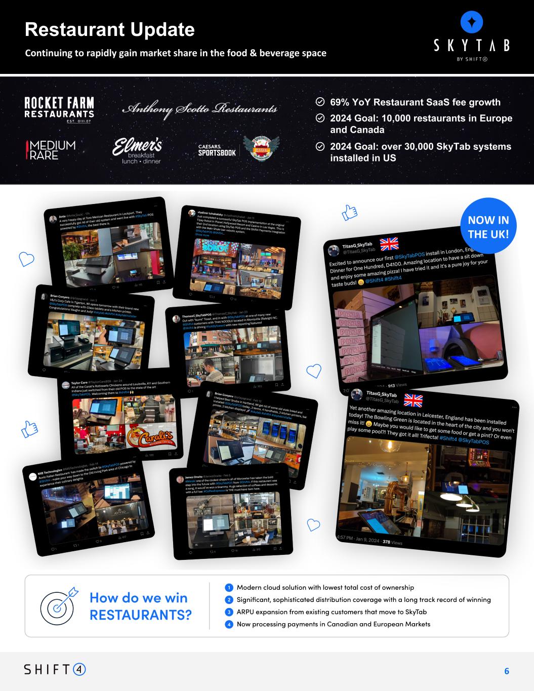 Continuing to rapidly gain market share in the food & beverage space 6 Intended Message: The rollout of SkyTab is accelerating, recent promotions are resonating with merchants who increasingly sensitive to cost• Highlight restaurants posted on Twitter/X and highlight ~5 operational sites in the UK (call this out) • NO location count updates • Provide commentary regarding consistent production, or accelerated production, something to provide confidence on our growth in USA and now UK/ Europe • Consider including some of the restaurant betas that Rohan is working in Canada? NOW IN THE UK! Restaurant Update 69% YoY Restaurant SaaS fee growth 2024 Goal: 10,000 restaurants in Europe and Canada 2024 Goal: over 30,000 SkyTab systems installed in US [ADD?]: 2024 Goal: install over 30,000 SKyTab POS systems domestically
