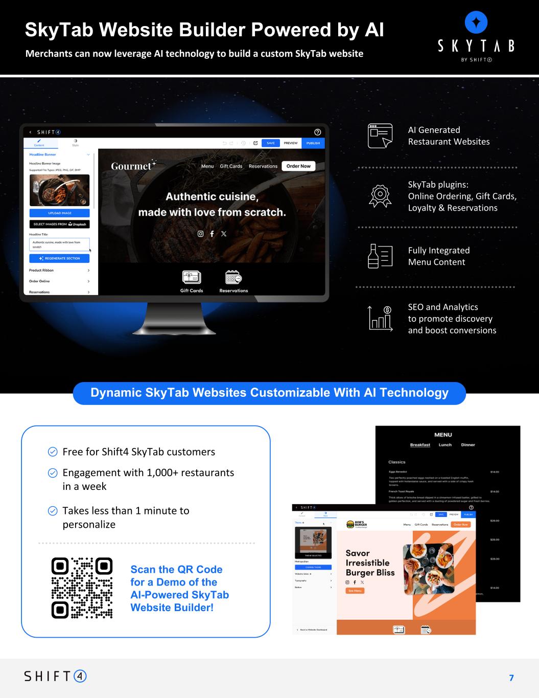 AI Generated Restaurant Websites Fully Integrated Menu Content SkyTab plugins: Online Ordering, Gift Cards, Loyalty & Reservations SEO and Analytics to promote discovery and boost conversions Merchants can now leverage AI technology to build a custom SkyTab website 7 SkyTab Website Builder Powered by AI Dynamic SkyTab Websites Customizable With AI Technology Scan the QR Code for a Demo of the AI-Powered SkyTab Website Builder! Free for Shift4 SkyTab customers Engagement with 1,000+ restaurants in a week Takes less than 1 minute to personalize