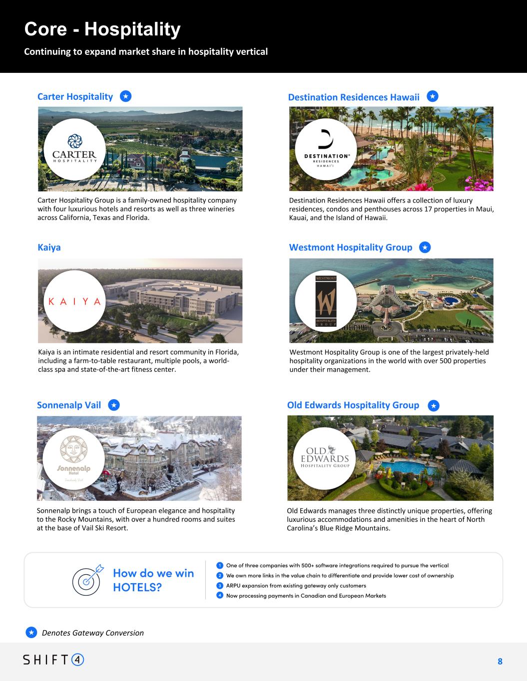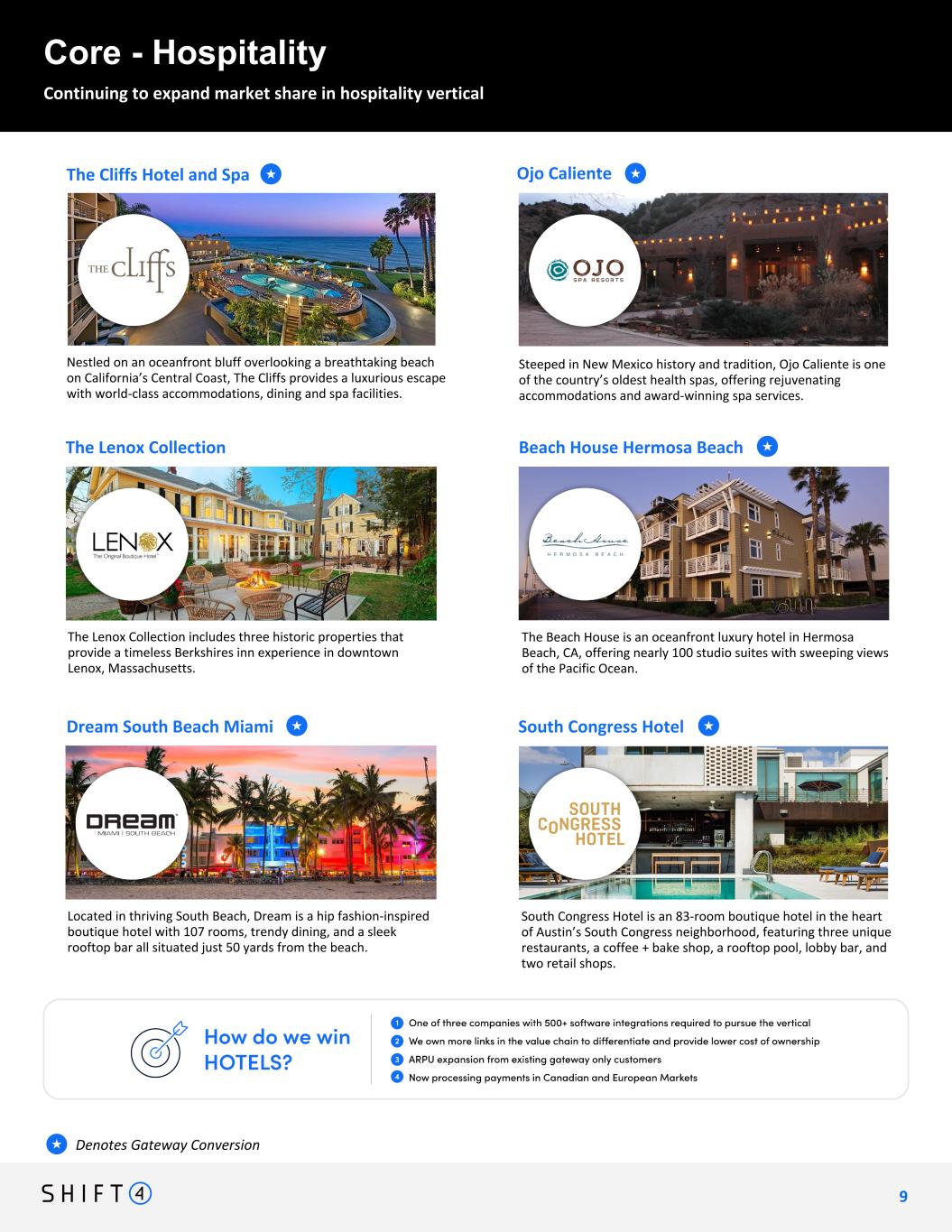 Continuing to expand market share in hospitality vertical Core - Hospitality Denotes Gateway Conversion★ Destination Residences Hawaii offers a collection of luxury residences, condos and penthouses across 17 properties in Maui, Kauai, and the Island of Hawaii. Destination Residences Hawaii Westmont Hospitality Group is one of the largest privately-held hospitality organizations in the world with over 500 properties under their management. Westmont Hospitality Group Kaiya is an intimate residential and resort community in Florida, including a farm-to-table restaurant, multiple pools, a world- class spa and state-of-the-art fitness center. Kaiya Carter Hospitality Group is a family-owned hospitality company with four luxurious hotels and resorts as well as three wineries across California, Texas and Florida. Carter Hospitality 8 8 ★ ★ • Highlight MGM properties • Carter Hospitality • + others ** still considering Sizzle video ★ Old Edwards manages three distinctly unique properties, offering luxurious accommodations and amenities in the heart of North Carolina’s Blue Ridge Mountains. Old Edwards Hospitality Group Sonnenalp brings a touch of European elegance and hospitality to the Rocky Mountains, with over a hundred rooms and suites at the base of Vail Ski Resort. Sonnenalp Vail ★★