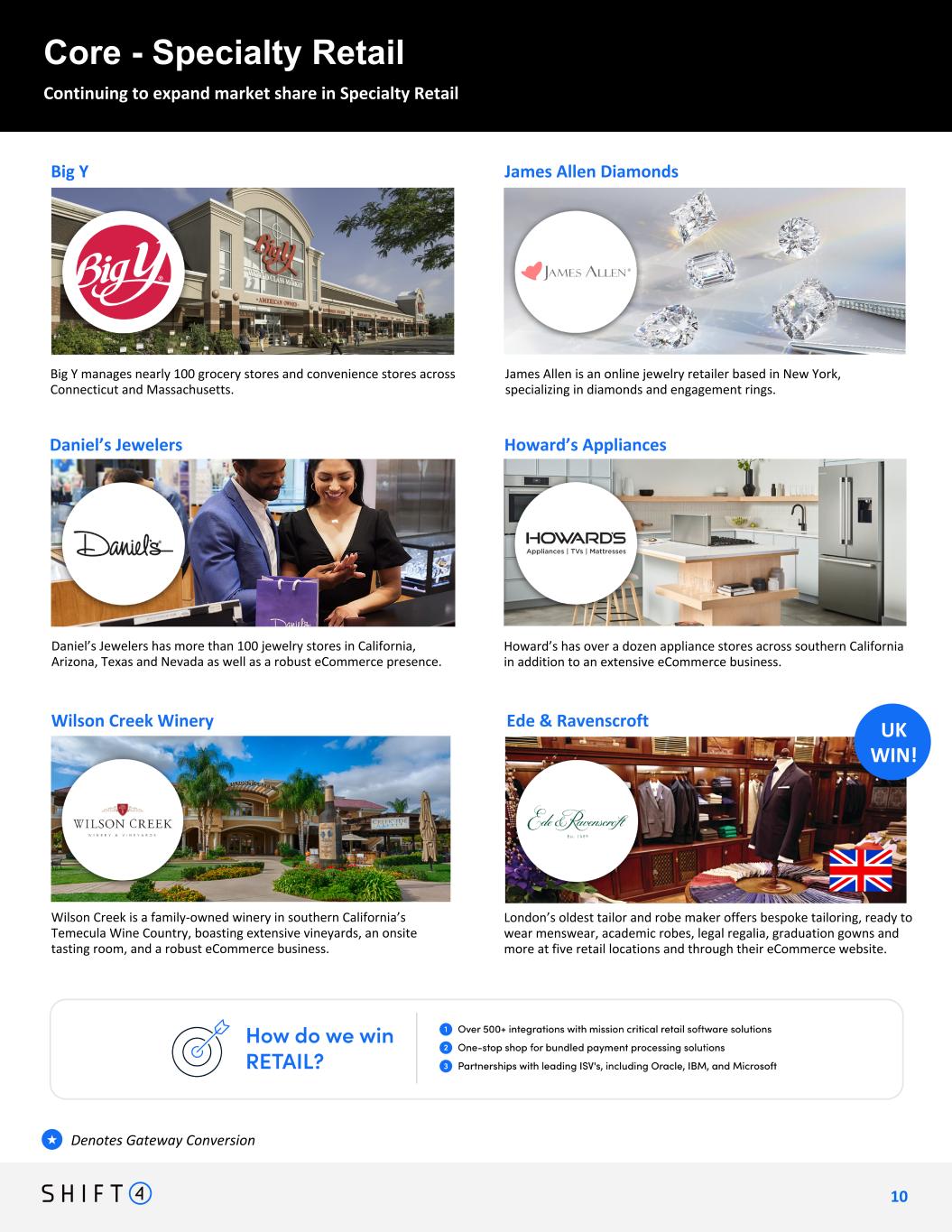 Core - Specialty Retail Denotes Gateway Conversion★ 1 0 10 Big Y manages nearly 100 grocery stores and convenience stores across Connecticut and Massachusetts. Daniel’s Jewelers James Allen is an online jewelry retailer based in New York, specializing in diamonds and engagement rings. James Allen Diamonds Daniel’s Jewelers has more than 100 jewelry stores in California, Arizona, Texas and Nevada as well as a robust eCommerce presence. Big Y Wilson Creek Winery Howard’s Appliances Wilson Creek is a family-owned winery in southern California’s Temecula Wine Country, boasting extensive vineyards, an onsite tasting room, and a robust eCommerce business. Howard’s has over a dozen appliance stores across southern California in addition to an extensive eCommerce business. London’s oldest tailor and robe maker offers bespoke tailoring, ready to wear menswear, academic robes, legal regalia, graduation gowns and more at five retail locations and through their eCommerce website. Ede & Ravenscroft UK WIN! Continuing to expand market share in Specialty Retail