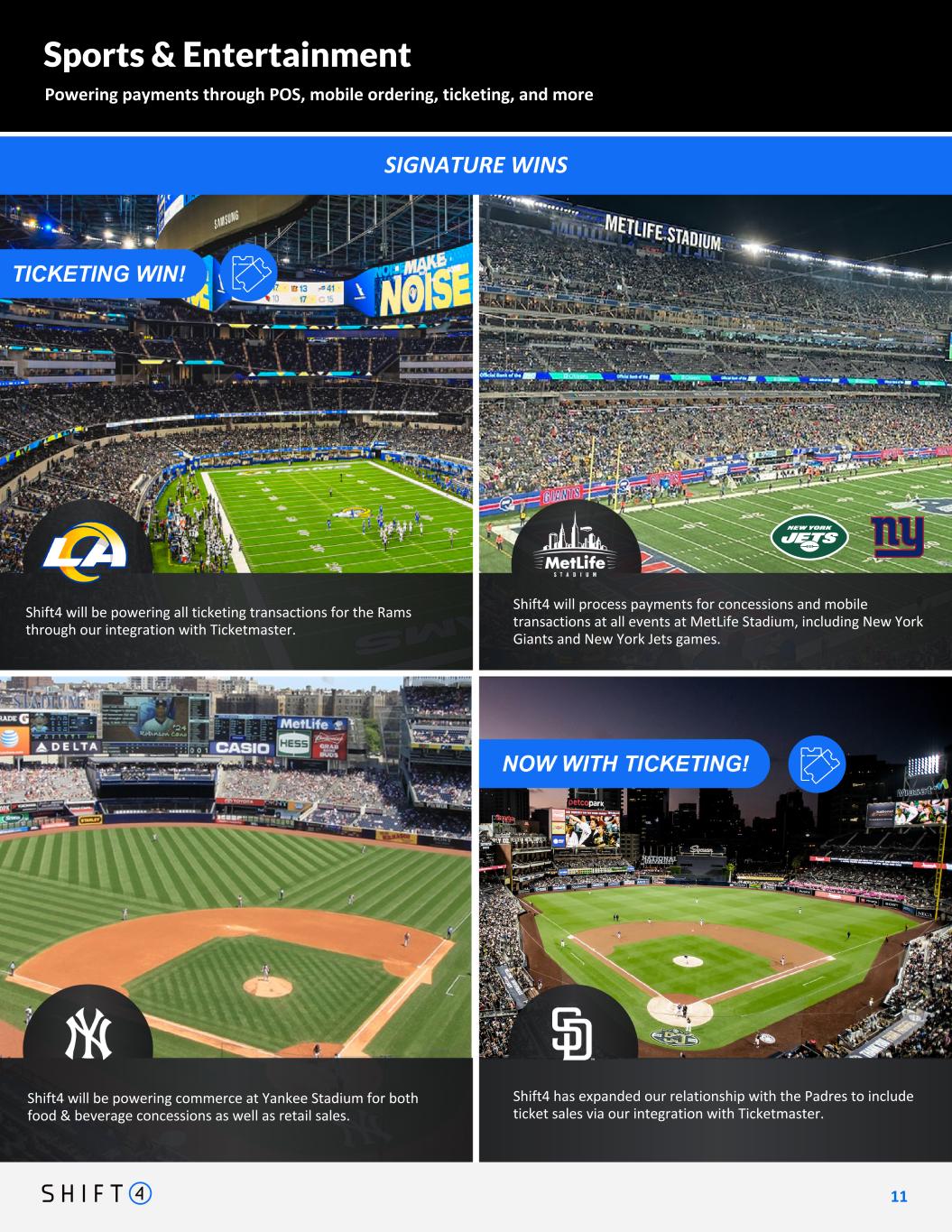 SIGNATURE WINS Sports & Entertainment Powering payments through POS, mobile ordering, ticketing, and more 1 1 11 Shift4 will be powering all ticketing transactions for the Rams through our integration with Ticketmaster. Shift4 will be powering commerce at Yankee Stadium for both food & beverage concessions as well as retail sales. Shift4 will be powering payments for all food and beverage concessions at NASCAR races across the country. Shift4 will process payments for concessions and mobile transactions at all events at MetLife Stadium, including New York Giants and New York Jets games. Shift4 will also be processing all ticket sales via our integration with Ticketmaster. Shift4 will be powering all ticketing transactions for the Rams through our integration with Ticketmaster. Shift4 will process payments for concessions and mobile transactions at all events at MetLife Stadium, including New York Giants and New York Jets games. Shift4 will be powering commerce at Yankee Stadium for both food & beverage concessions as well as retail sales. Shift4 has expanded our relationship with the Padres to include ticket sales via our integration with Ticketmaster.