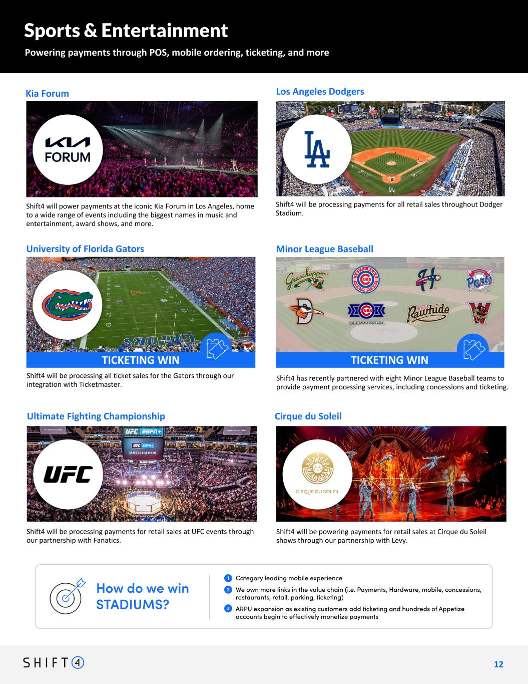 Kia Forum Sports & Entertainment Powering payments through POS, mobile ordering, ticketing, and more 1 2 12 Shift4 has recently partnered with eight Minor League Baseball teams to provide payment processing services, including concessions and ticketing. Minor League Baseball Shift4 will power payments at the iconic Kia Forum in Los Angeles, home to a wide range of events including the biggest names in music and entertainment, award shows, and more. Shift4 will be powering payments for retail sales at Cirque du Soleil shows through our partnership with Levy. Cirque du Soleil Shift4 will be processing payments for retail sales at UFC events through our partnership with Fanatics. Ultimate Fighting Championship • replace w. kia forum OR kansas city current - have the other one as a backup • add a box for Minor League baseball and include these logos: • Greensboro Grasshoppers (F&B) South Bend Cubs (F&B) Harrisburg Senators (F&B) Stockton Ports (F&B) Delmarva Shorebirds (F&B) Sloan Park (F&B) Visalia Rawhide (ticketing via TicketReturn) Washington Wild Things (ticketing via TicketReturn) Shift4 will be processing all ticket sales for the Gators through our integration with Ticketmaster. University of Florida Gators TICKETING WIN Shift4 will be processing payments for all retail sales throughout Dodger Stadium. Los Angeles Dodgers TICKETING WIN